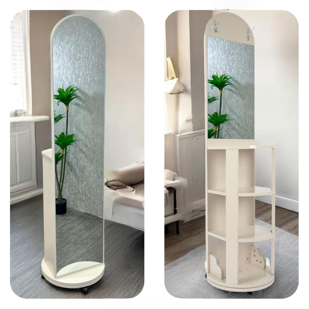 مرايا طوليه متحركة مع قاعدة دواره و ارفف خشبيه لعرض أدوات الزينة و المقتنيات والكتب لإضفاء لمسة جمال لغرفة النوم والمكتب والمكان الذي توضع فيه مراية الارفف توفر لك منظر جمالي و مساحة إضافية في الغرفة , مرايا الارفف مصنوعه من الزجاج و هيكل من الخشب عالي الدقة وقاعدة خشب دواره ومتحركة مما يسهل نقلها من مكان لأخر , مراية الارفف متوفر منها عدة ألوان لتتناسب مع الديكور المنزلي , مرايا الارفف يمكنك تنظيفها بمسحة رقيقة .