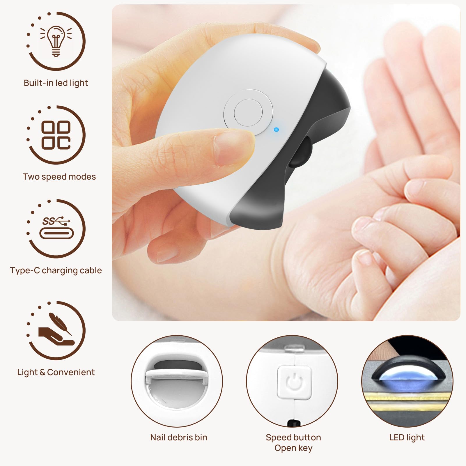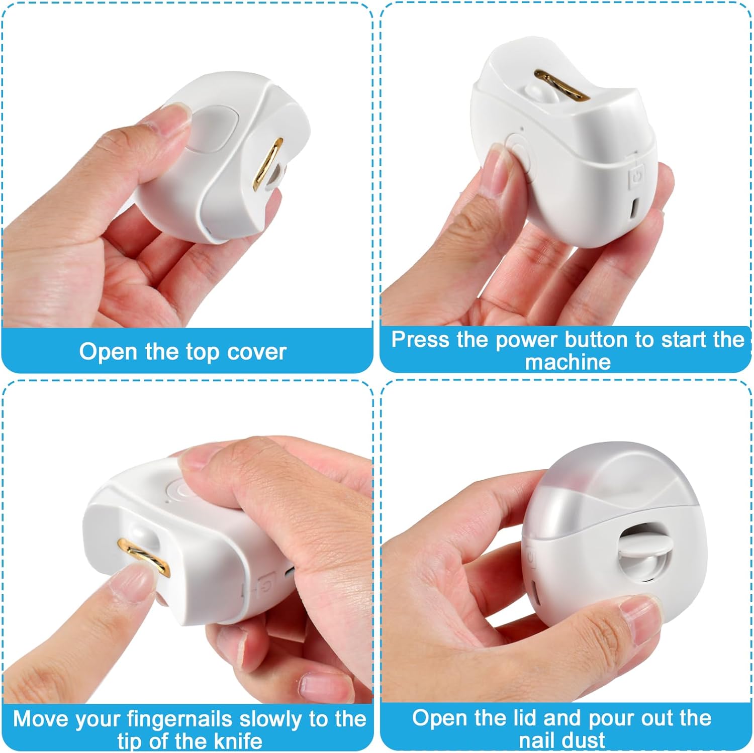 - 1. نظيف وصحي: حتى الأطفال أو كبار السن يمكنهم استخدام مقص الأظافر الكهربائي هذا دون قراءة دليل المستخدم. ستجمع سلة المهملات الصغيرة المدمجة في جهاز العناية بالأظافر جميع الأظافر المقصوصة، لذلك لا داعي للقلق بشأن التنظيف العام.