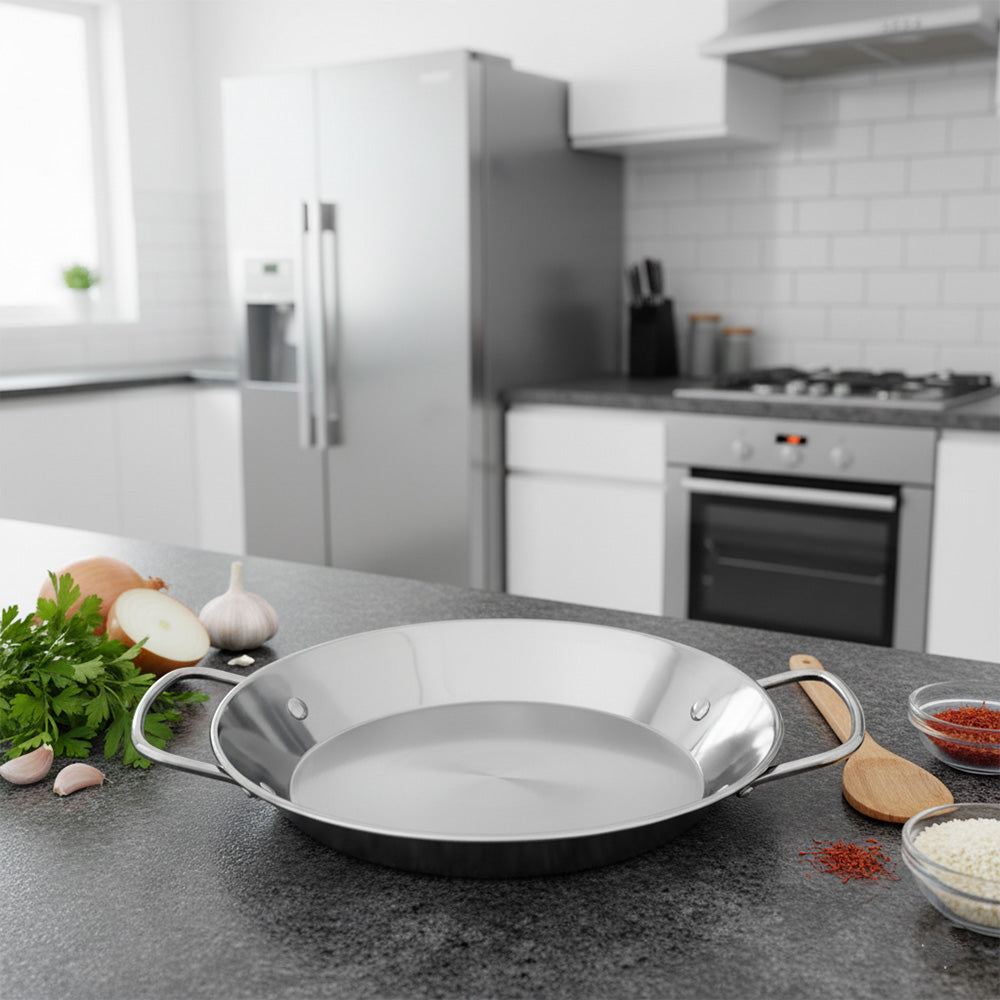 بفضل مقبضيها الجانبيين المتينين، تُسهّل عملية الاستخدام والتقديم مباشرةً من الموقد أو الفرن إلى الطاولة. تصميمها العريض والسطحي يجعلها مثالية لتحضير وتقديم أطباق المأكولات البحرية، والباييلا، والأطباق المقلية، والأطباق المشوية.