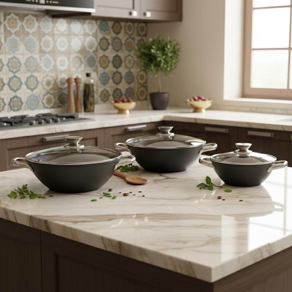 متوفرة بأحجام متعددة (20 سم، 26 سم، 28 سم) لتناسب مختلف احتياجات الطهي. مثالية للمطابخ المنزلية التي تبحث عن أواني طهي تدوم طويلًا بتصميم عصري.