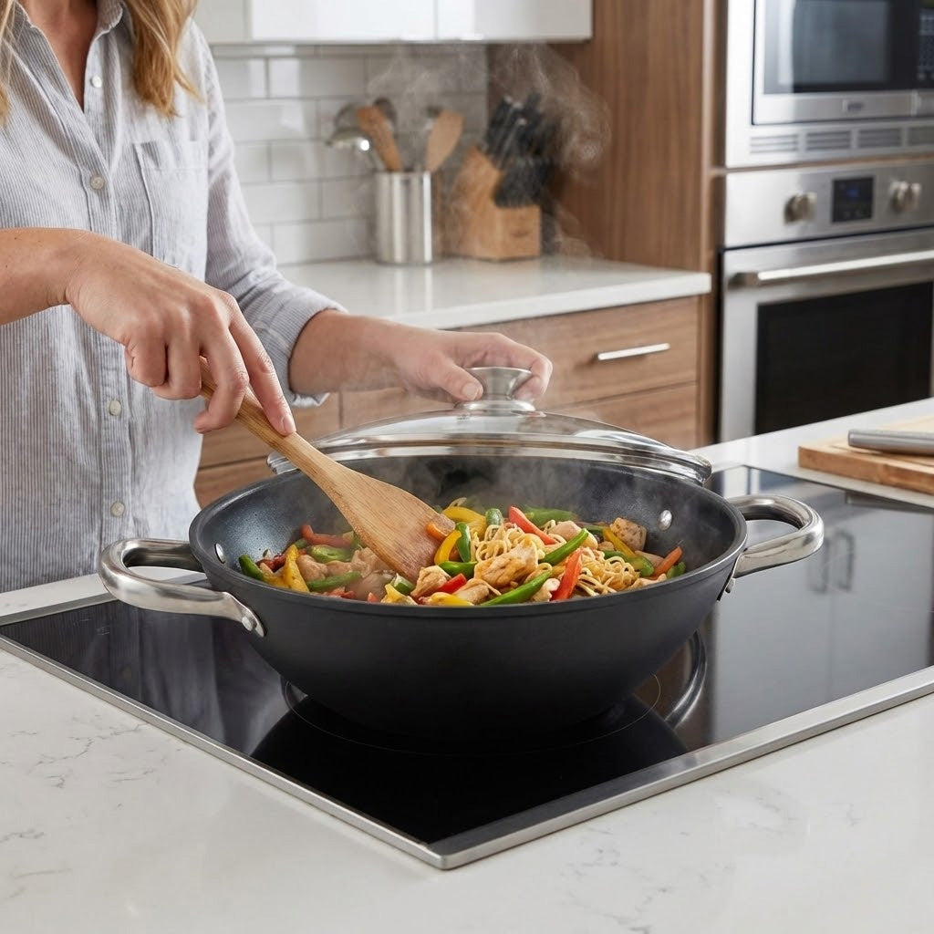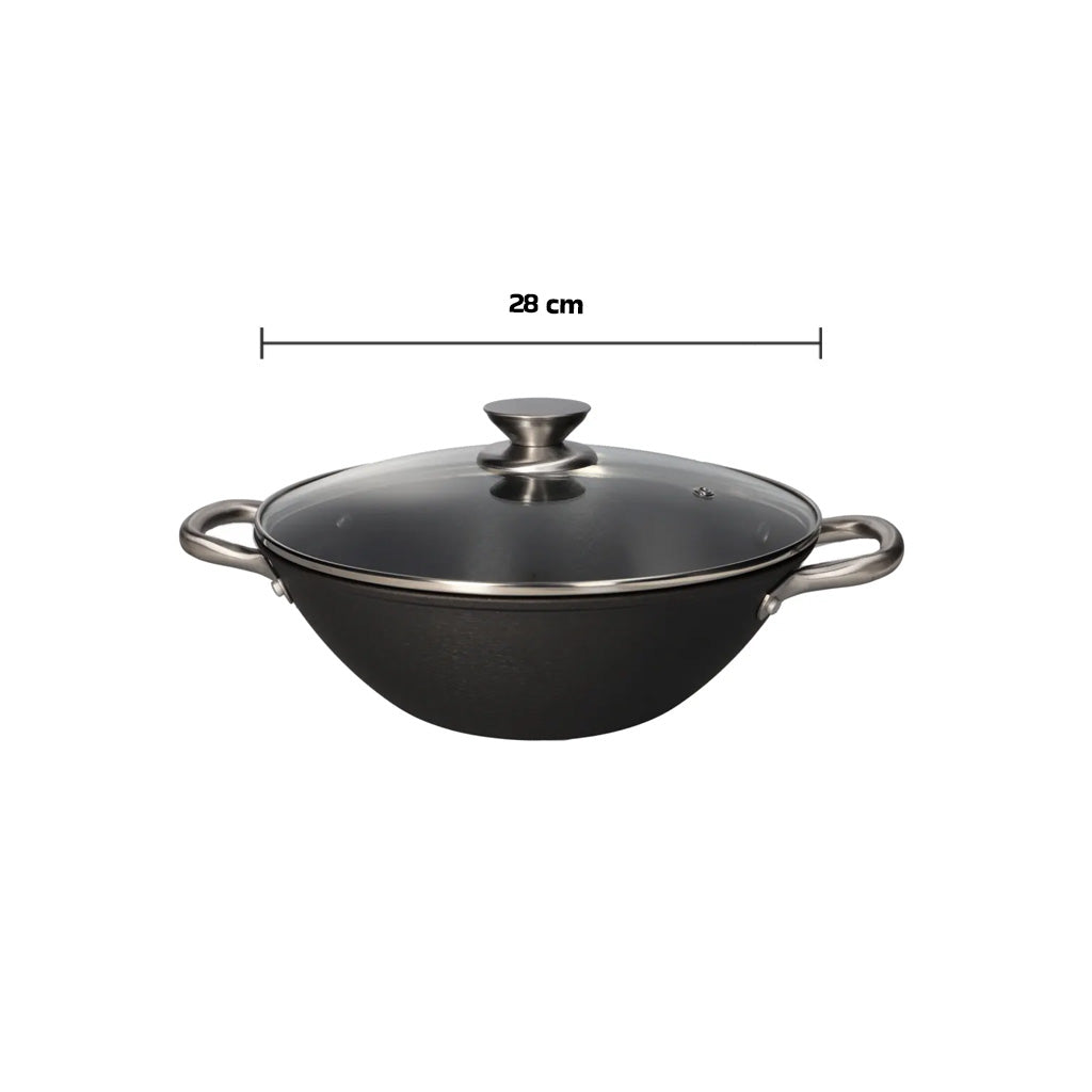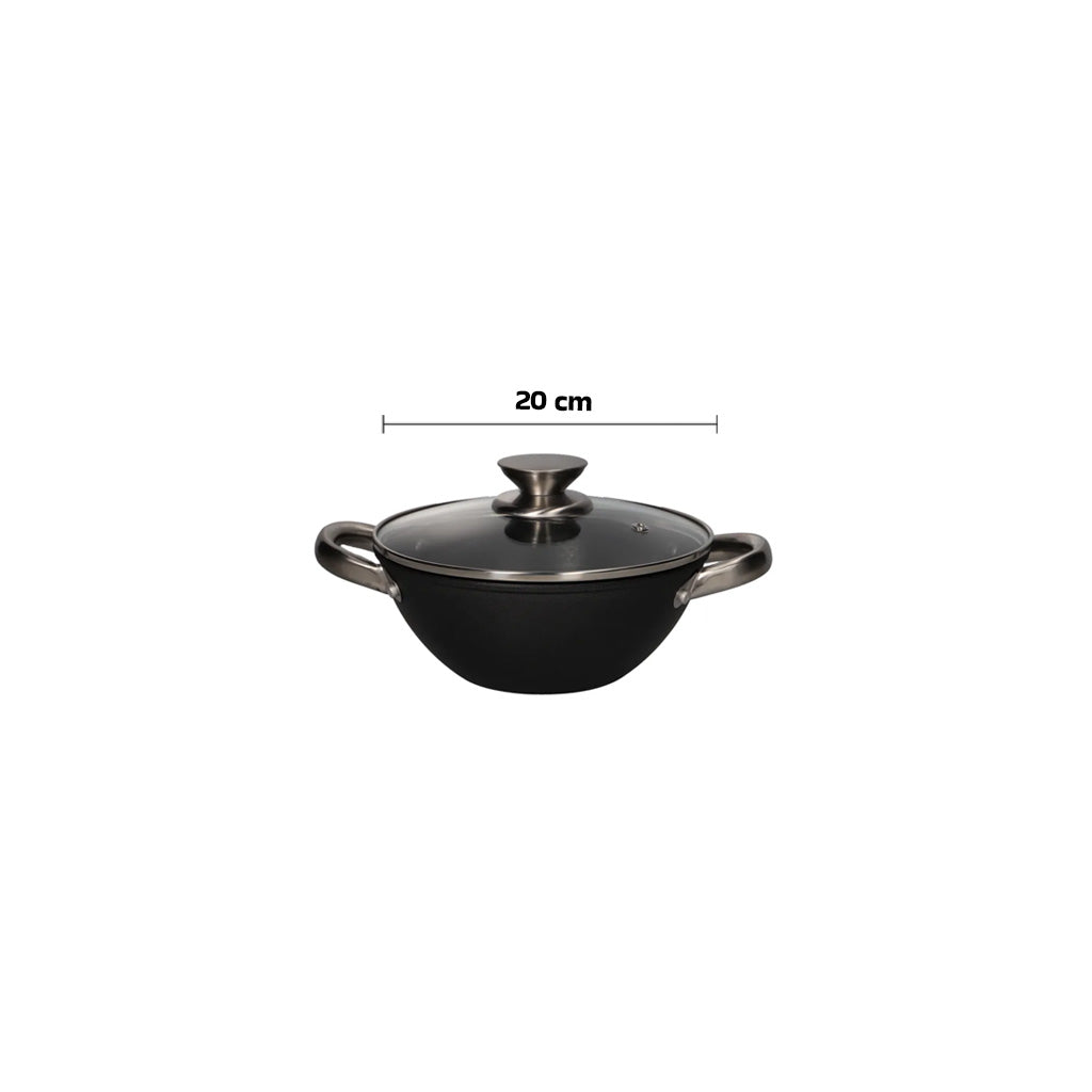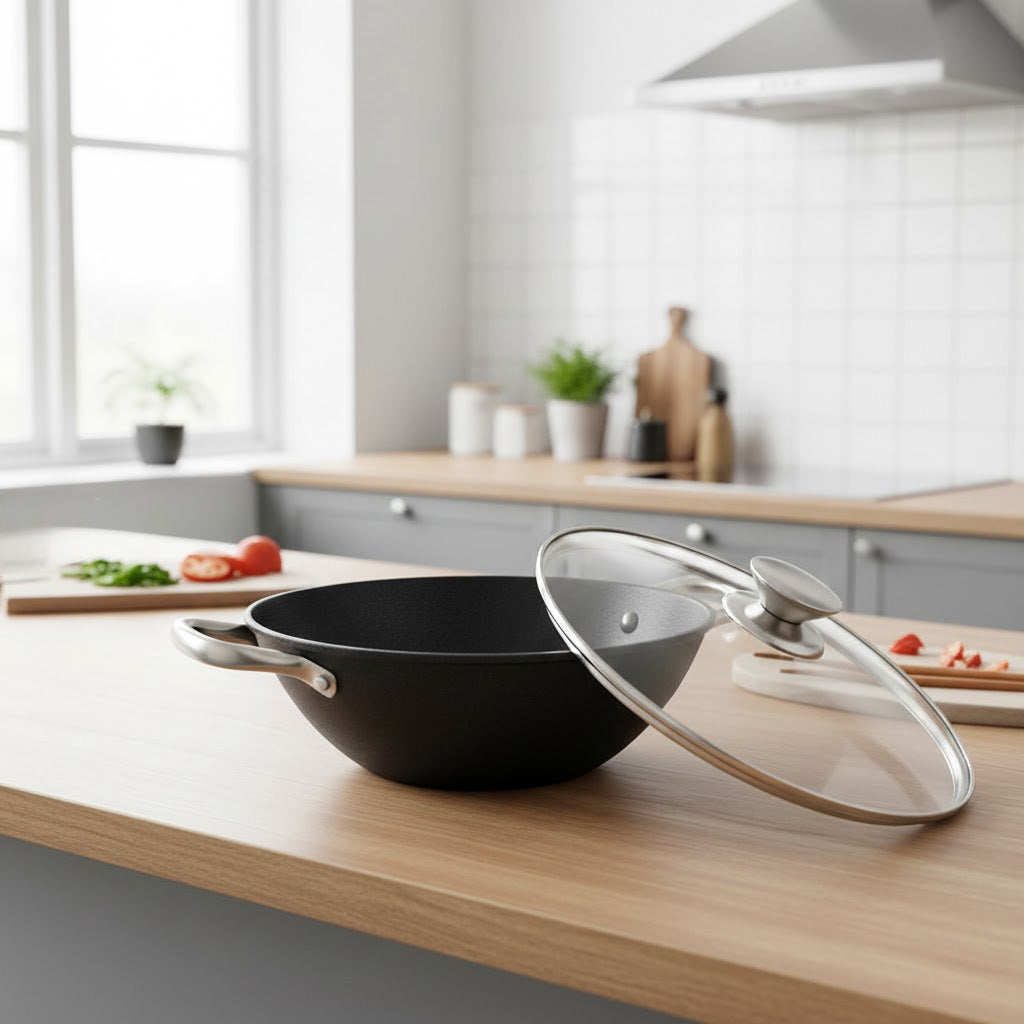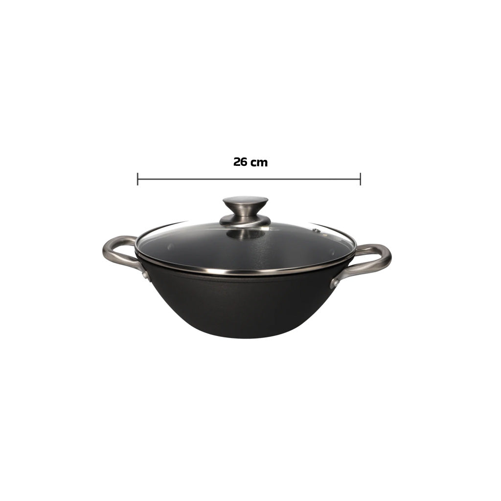 تتميز بطلاء أسود متين، وغطاء زجاجي مقوى لحفظ الحرارة والرطوبة، ومقابض جانبية قوية لسهولة الاستخدام وأمانه. مناسبة لمجموعة واسعة من الأطباق مثل القلي السريع، والكاري، واليخنات، والقلي العميق.