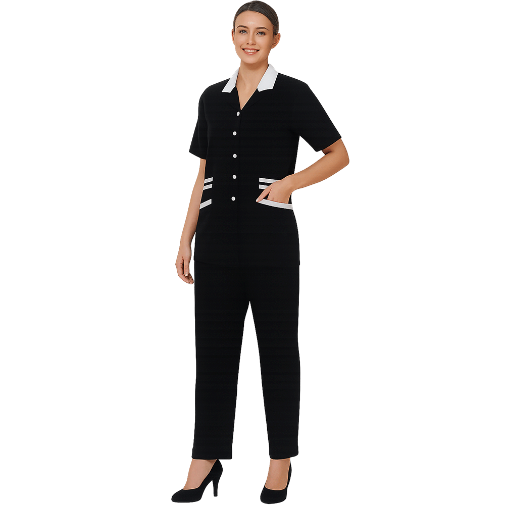 اليونيفورم يبدو مناسبًا لأعمال الضيافة أو الخدمات، بتصميم يجمع بين العملية والمظهر المرتب.
