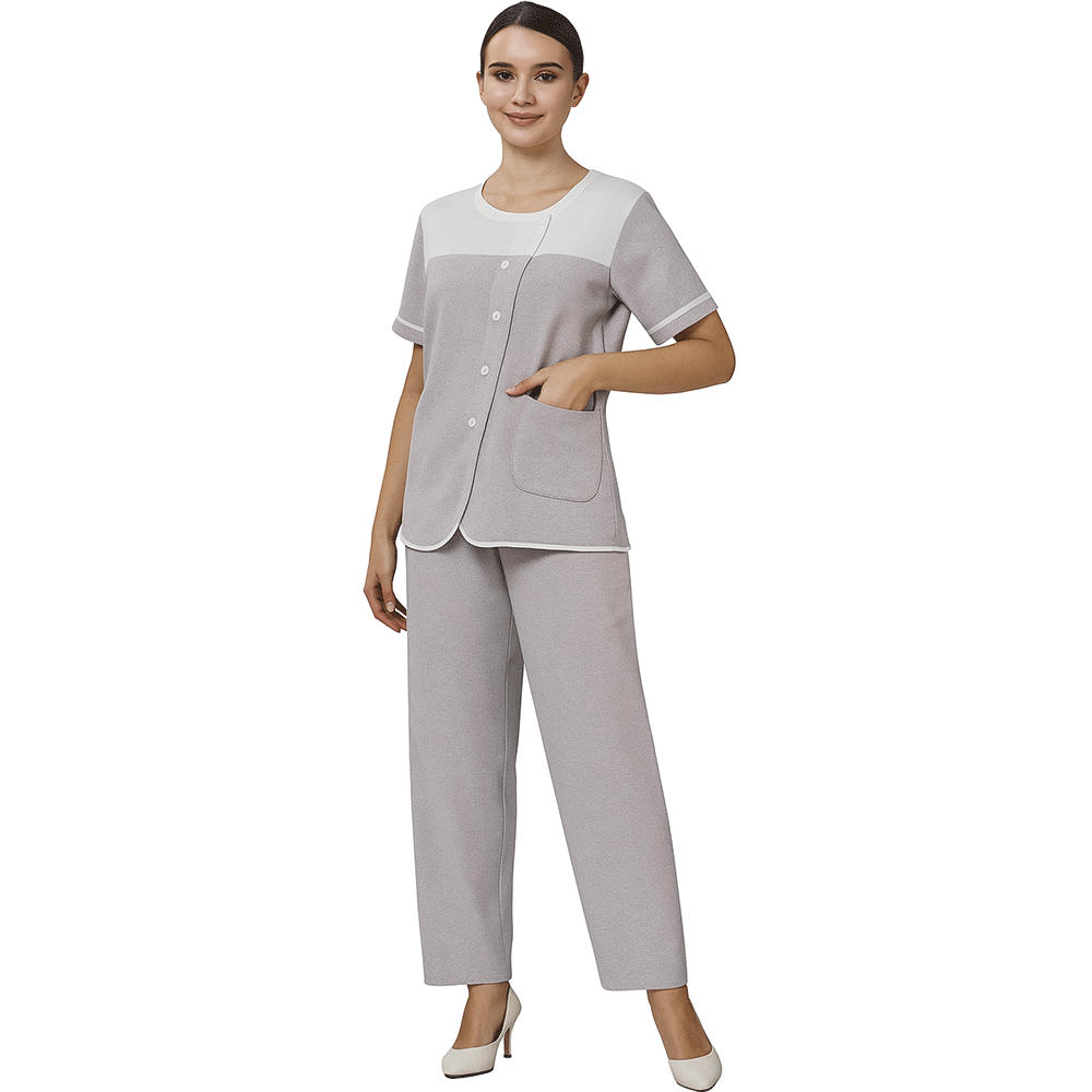 اليونيفورم يعطي إحساسًا مهنيًا ومهذبًا، بلمسات تصميمية ناعمة تجمع بين البساطة والأناقة، مناسب لبيئات العمل مثل الصالونات، العيادات، والاستقبال.