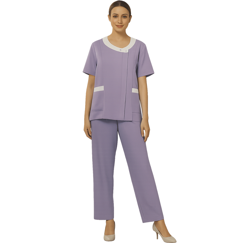 اليونيفورم يعطي إحساسًا بالبساطة الراقية، مع تفاصيل دقيقة تضيف أناقة، مثل الطية الأمامية وخطوط الجيوب والياقة المحددة، مما يجعله مناسبًا للعيادات، الصالونات، والاستقبال.
