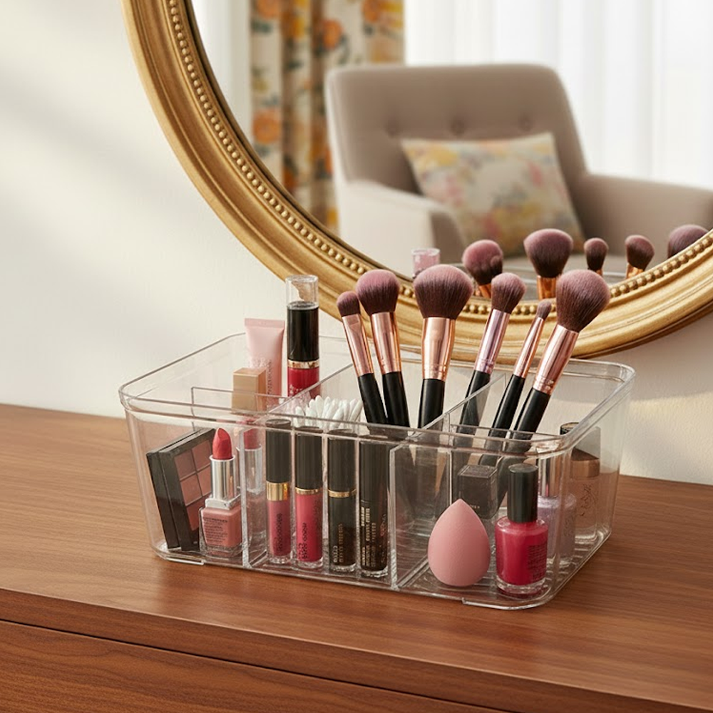 يتميز بتقسيمات عملية بأحجام مختلفة تناسب الفرش، أحمر الشفاه، الكريمات، العطور، الإكسسوارات القطنية، والإكسسوارات الصغيرة، مما يجعله مثاليًا لطاولة الزينة أو الحمام أو غرفة النوم.