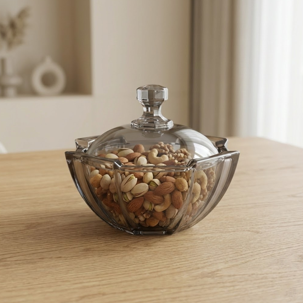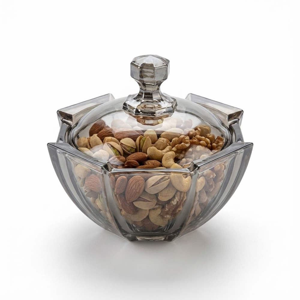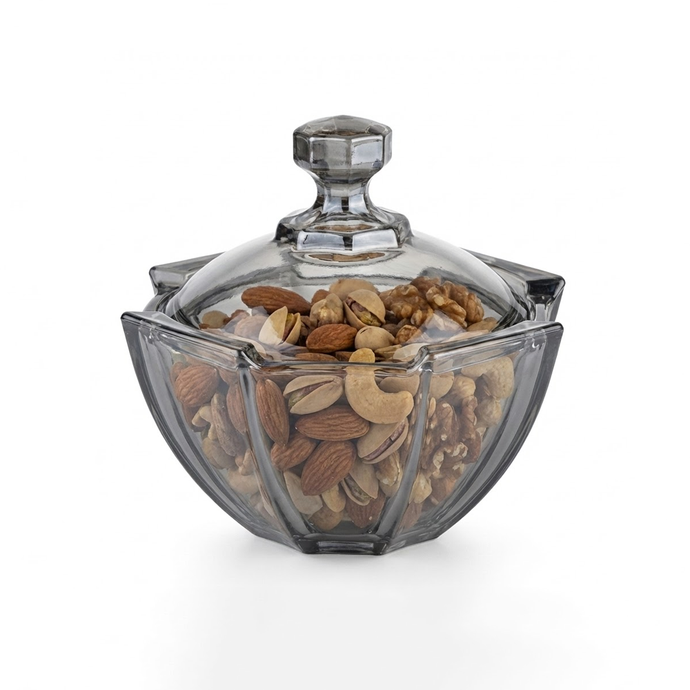 وعاء تقديم زجاجي أنيق بغطاء شفاف – مثالي للمكسرات والشوكولاتة