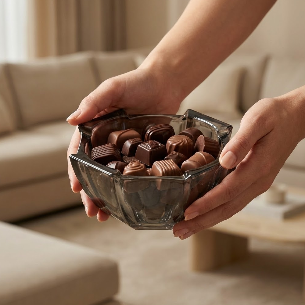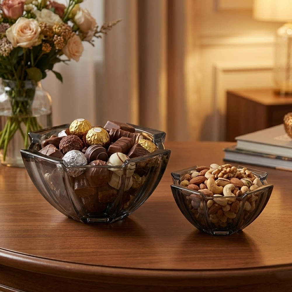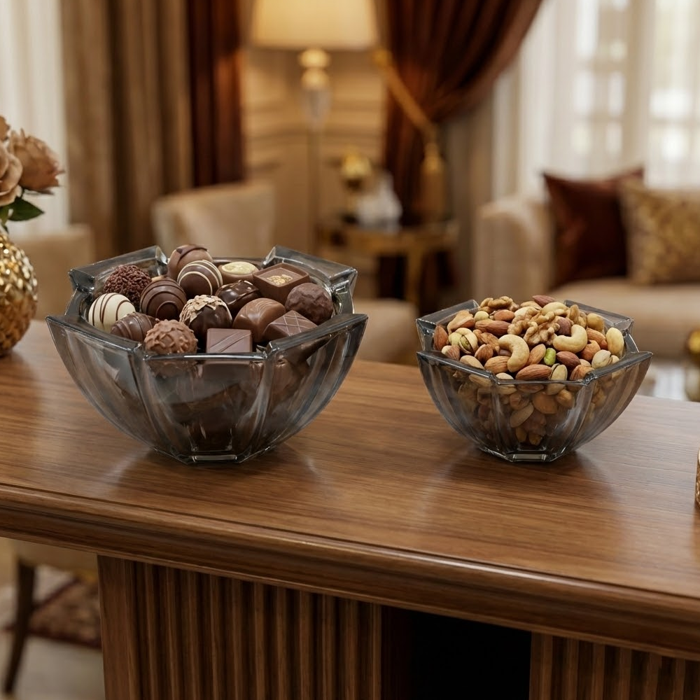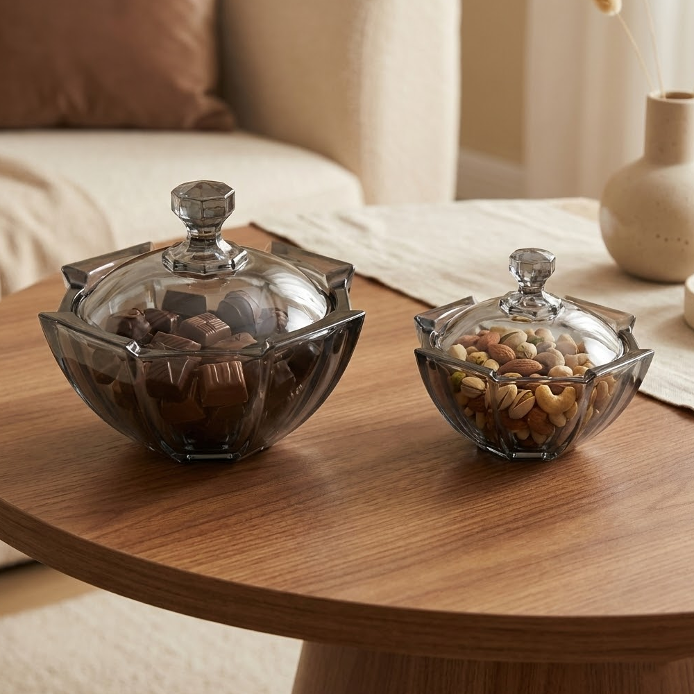 مثالي لتقديم المكسرات، الشوكولاتة، الحلويات، التمر، أو الضيافة اليومية، كما ينسجم بسهولة مع مختلف أنماط الديكور بفضل لونه الزجاجي الدخاني الهادئ. تصميمه العملي يسمح بالاستخدام على طاولات القهوة أو السفرة، ويضيف لمسة فخامة لأي مناسبة.