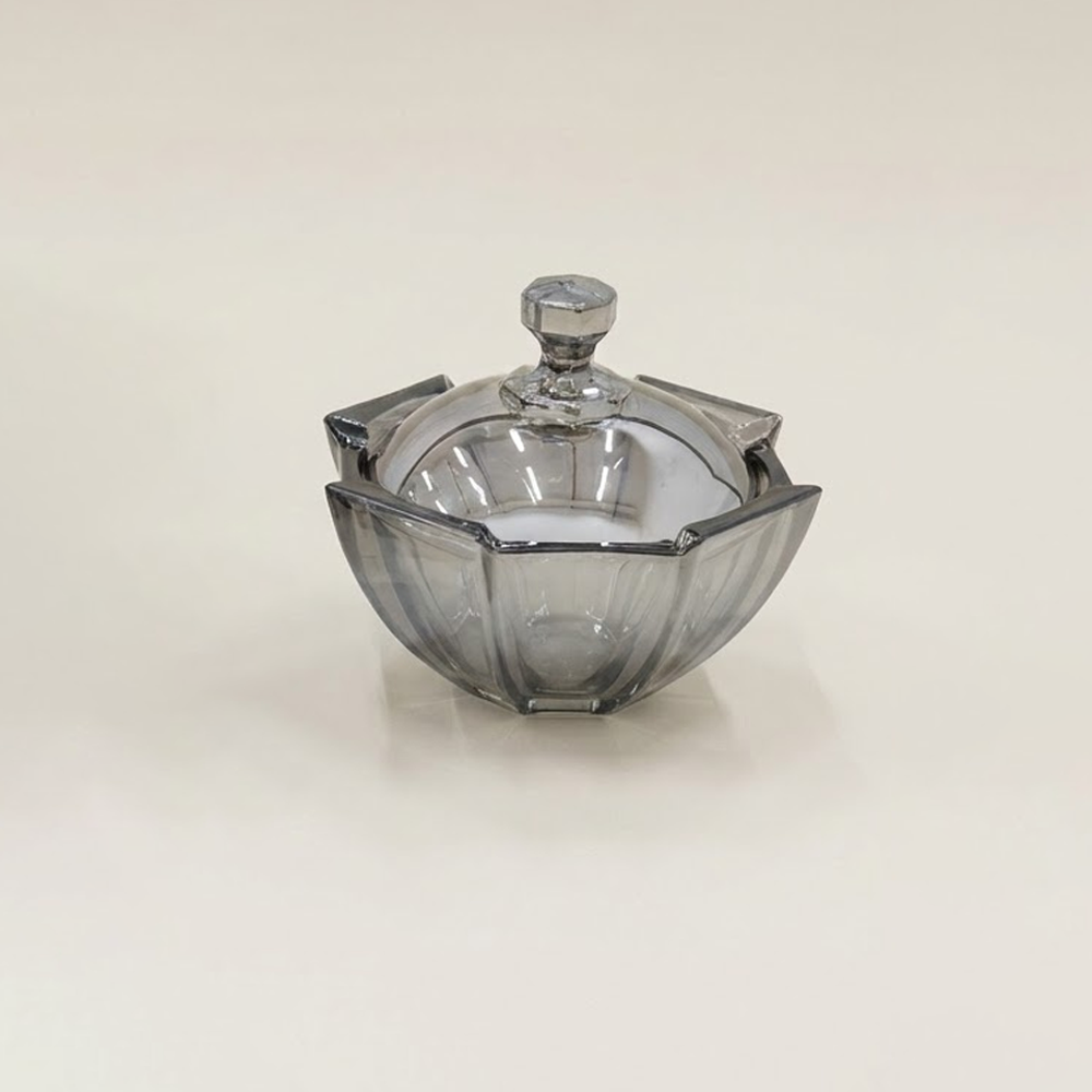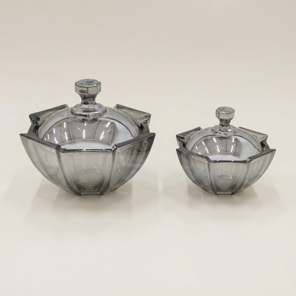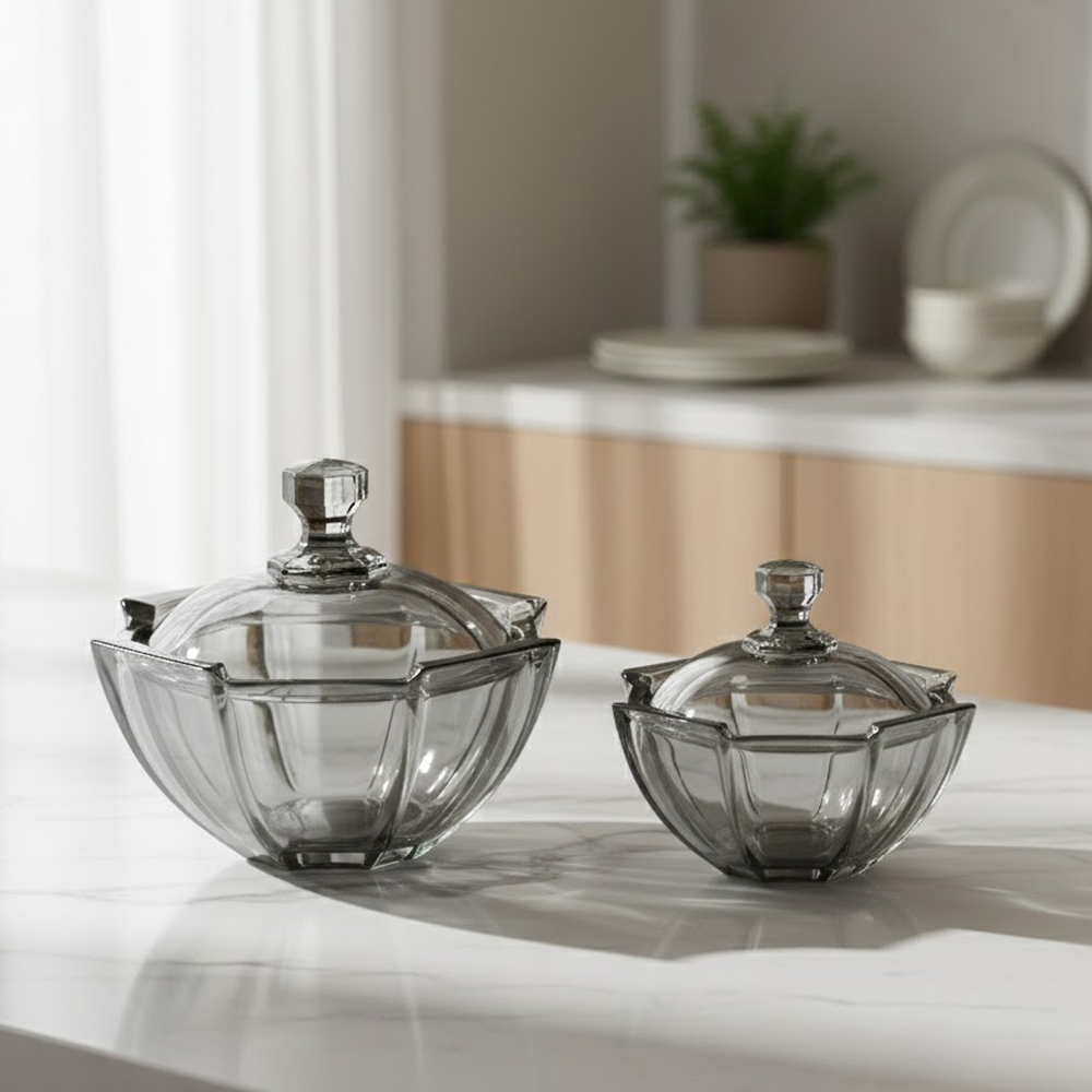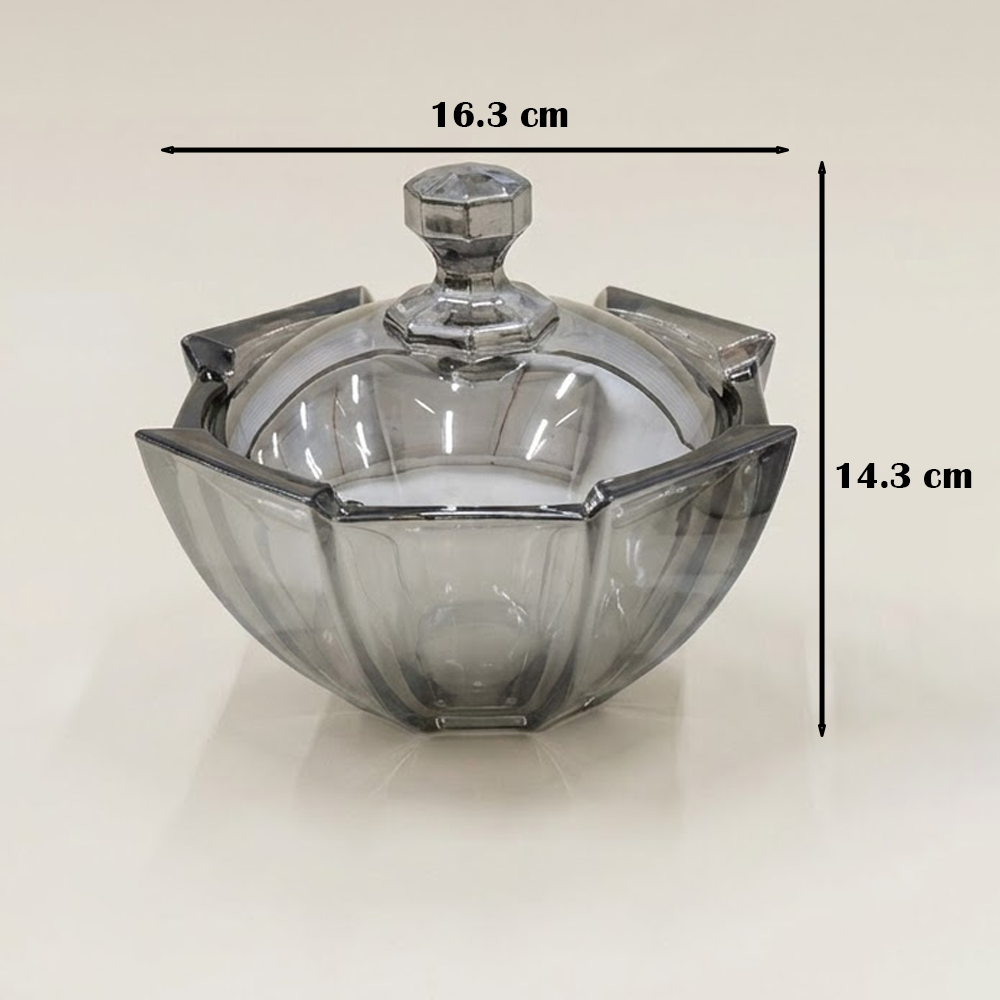 مثالي لتقديم المكسرات، الشوكولاتة، الحلويات، التمر، أو الضيافة اليومية، كما ينسجم بسهولة مع مختلف أنماط الديكور بفضل لونه الزجاجي الدخاني الهادئ. تصميمه العملي يسمح بالاستخدام على طاولات القهوة أو السفرة، ويضيف لمسة فخامة لأي مناسبة.