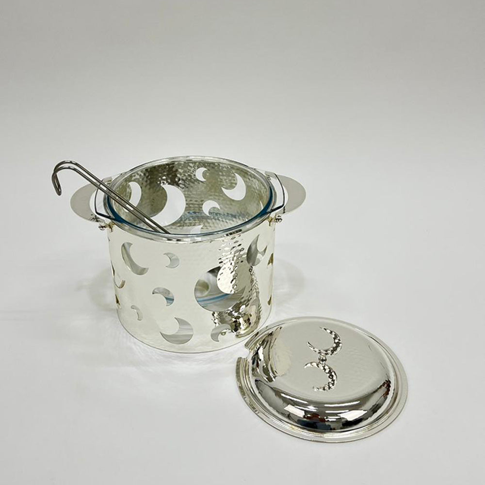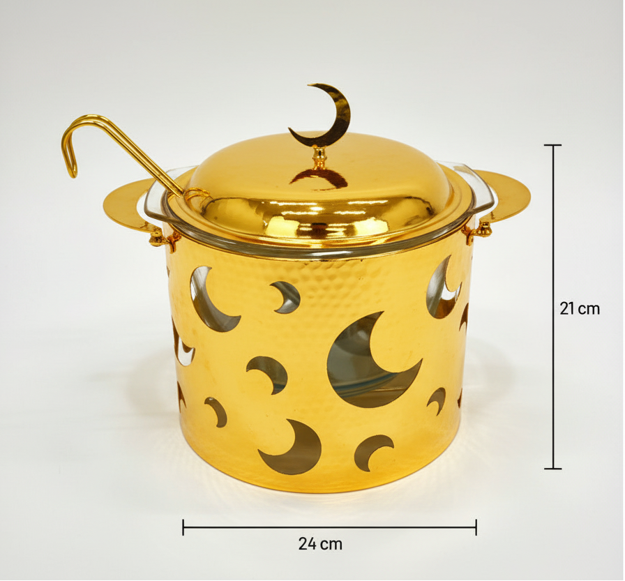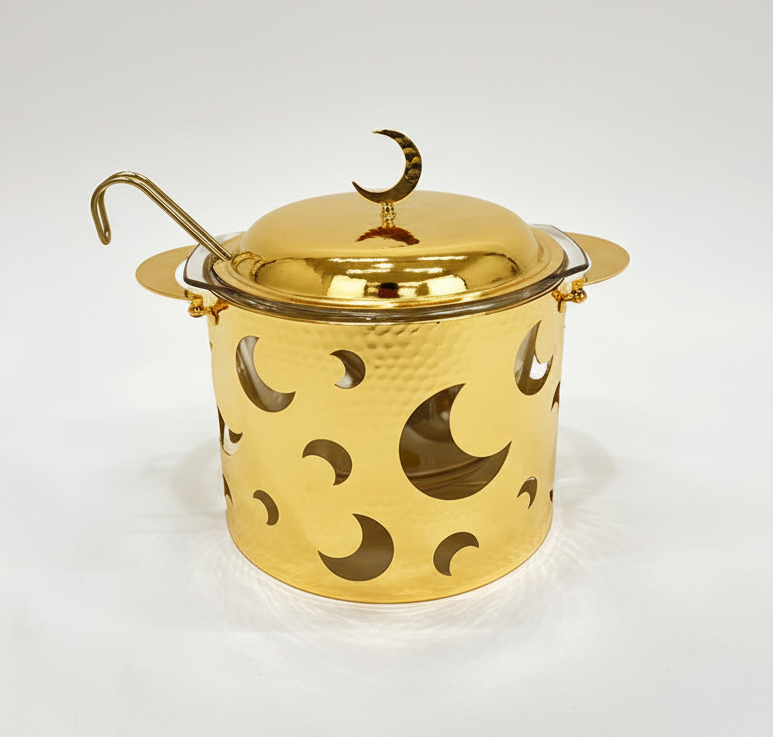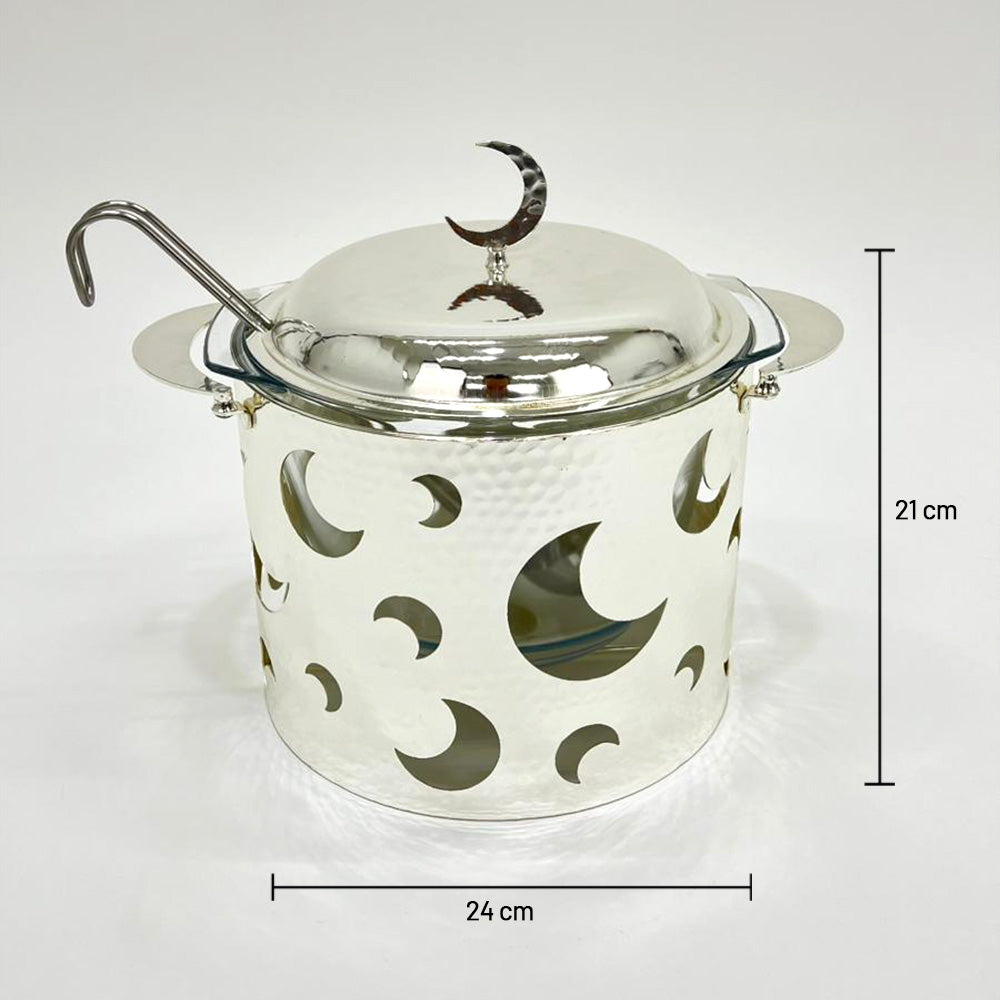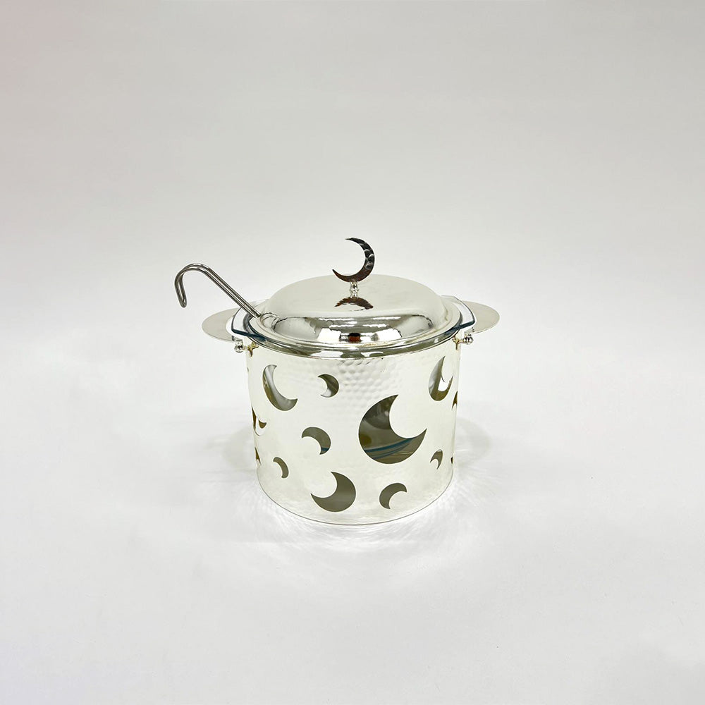 أضف لمسةً من الأناقة السماوية إلى طاولتك مع وعاء التقديم المصنوع من الفولاذ المقاوم للصدأ بتصميم القمر. يتميز هذا الوعاء بنقوش هلالية رائعة، ويعكس انعكاسات ساحرة، ويجمع بين الأسلوب العصري والحرفية التقليدية. يحتوي الوعاء على بطانة زجاجية مقاومة للحرارة، مثالية لتقديم الحساء والصلصات والحلويات والمشروبات الساخنة. يُضفي الغطاء المصنوع من الفولاذ المقاوم للصدأ، والمُزين بمقبض على شكل قمر، لمسةً من الفخامة على مظهره، بينما تُوفر المغرفة المرفقة سهولةً في التقديم.