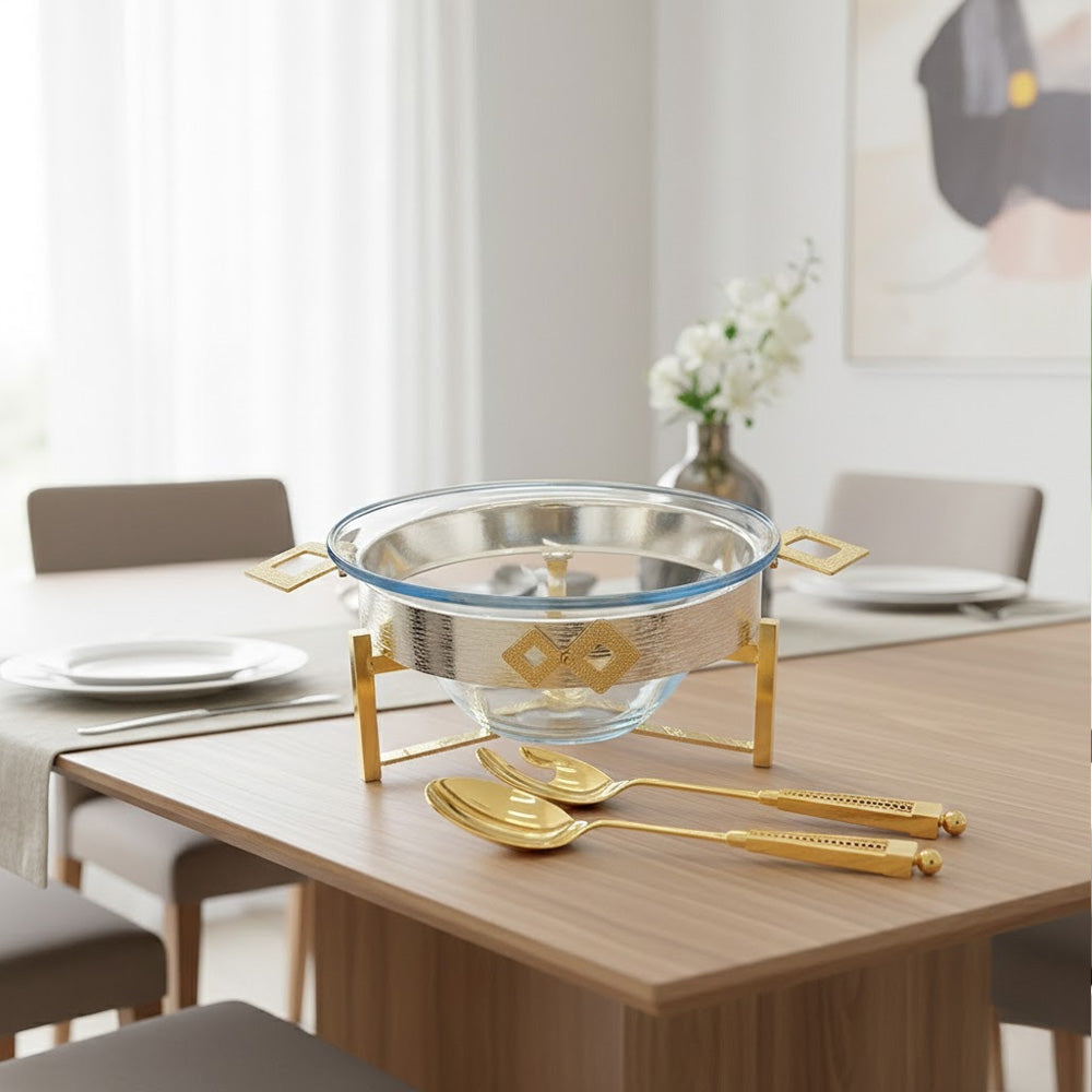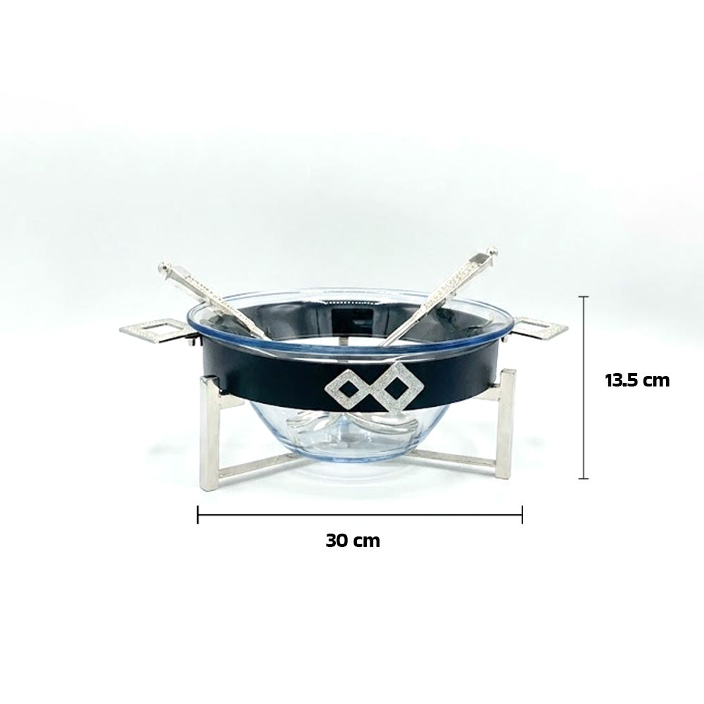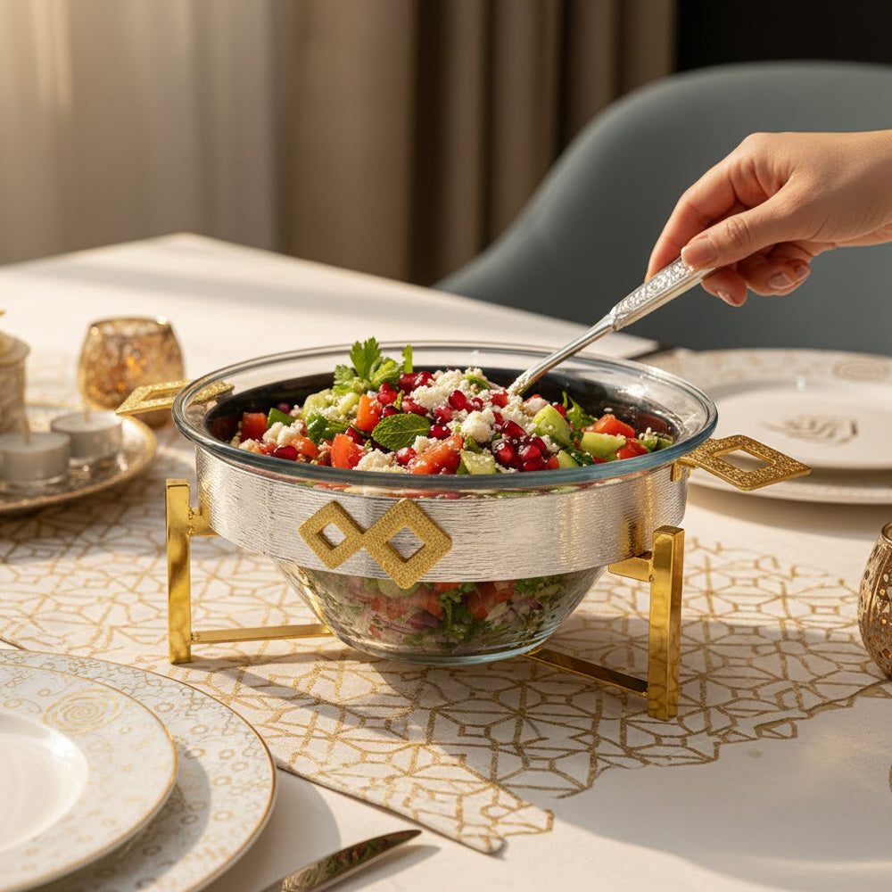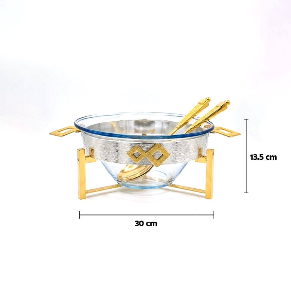 طقم تقديم متكامل: يشمل الوعاء الزجاجي، والحامل المعدني المرتفع، وملاعق تقديم السلطة.
