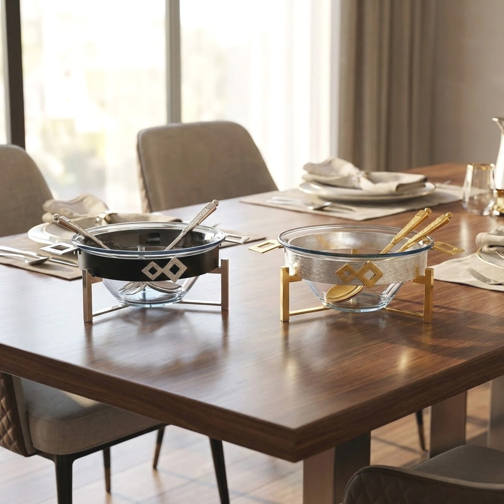 أضف لمسة من الفخامة إلى مائدتك مع طقم أوعية السلطة الزجاجية "دايموند موتيف" سعة 4 لترات. يجمع هذا الطقم الفاخر بين التصميم العصري والأناقة العملية. مصنوع من زجاج شفاف عالي الجودة، مدعوم بحامل معدني متين وأنيق، ويتميز بتصميم هندسي فريد على شكل ماسة يضفي لمسة من الفخامة على أي وجبة.