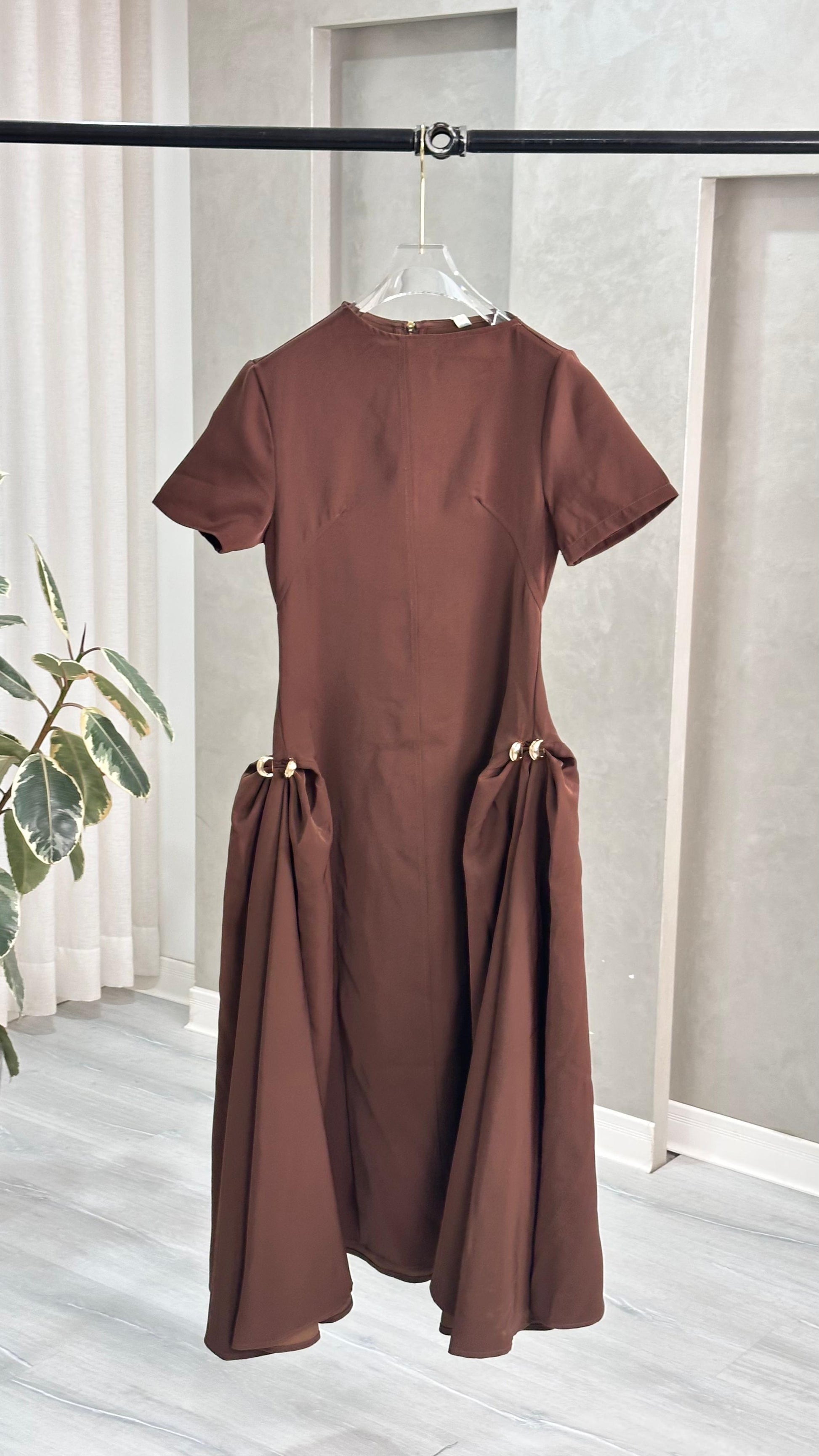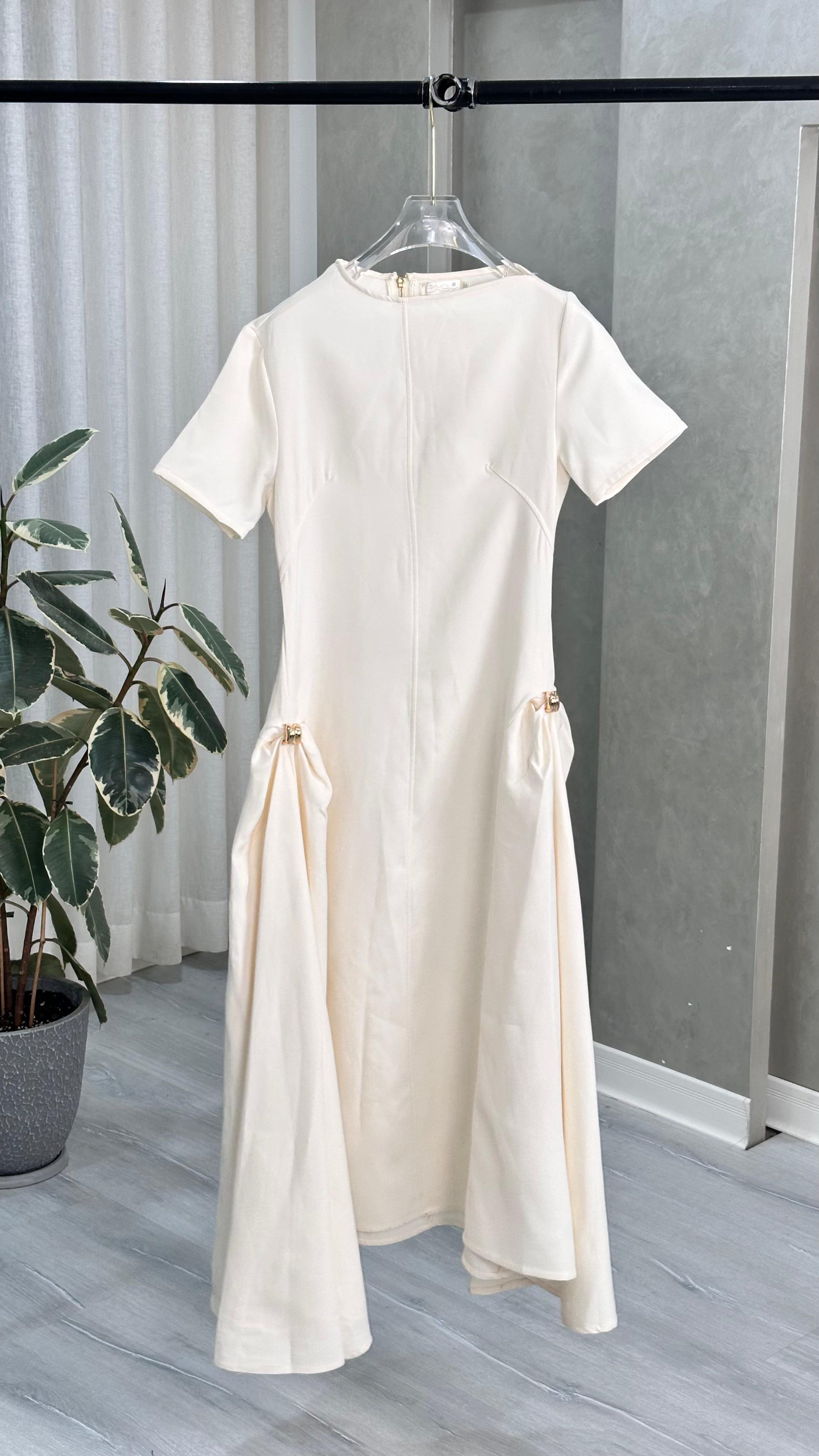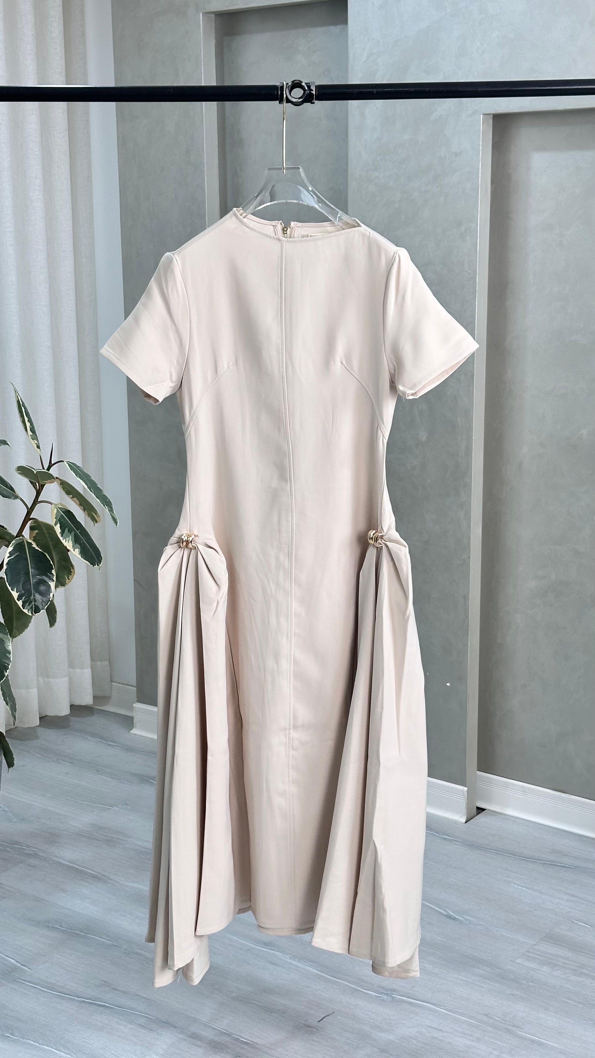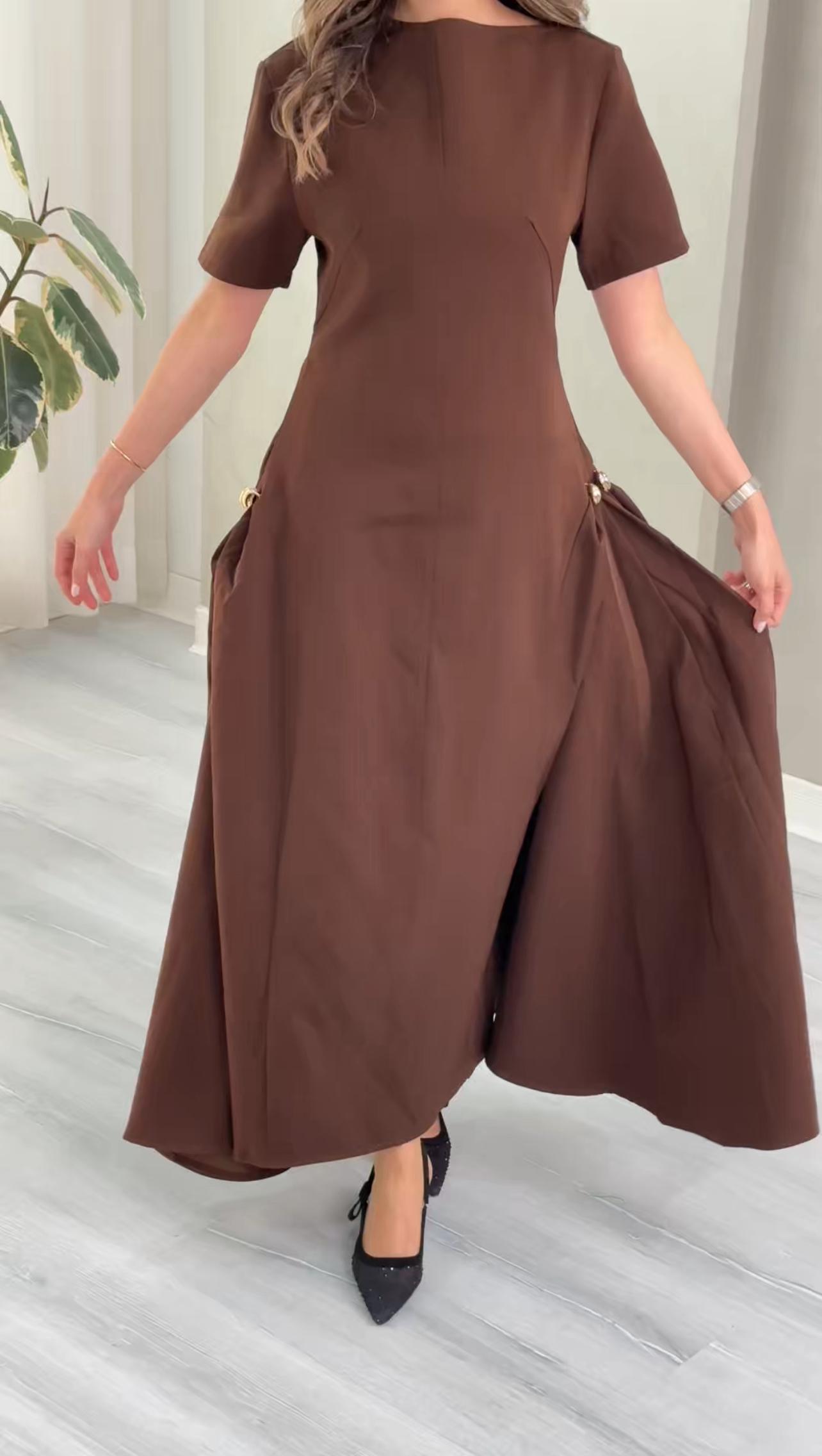 فستان أنيق بتصميم كلاسيكي عصري، يتميز بقصة واسعة وانسيابية تضيف لمسة من الرقي والأنوثة. مزود بأكمام قصيرة لمظهر أنثوي ناعم، مع تفاصيل طيات عمودية تمنح التصميم حركة وجاذبية. مثالي للمناسبات الخاصة والسهرات، ويجمع بين البساطة والفخامة في آن واحد.