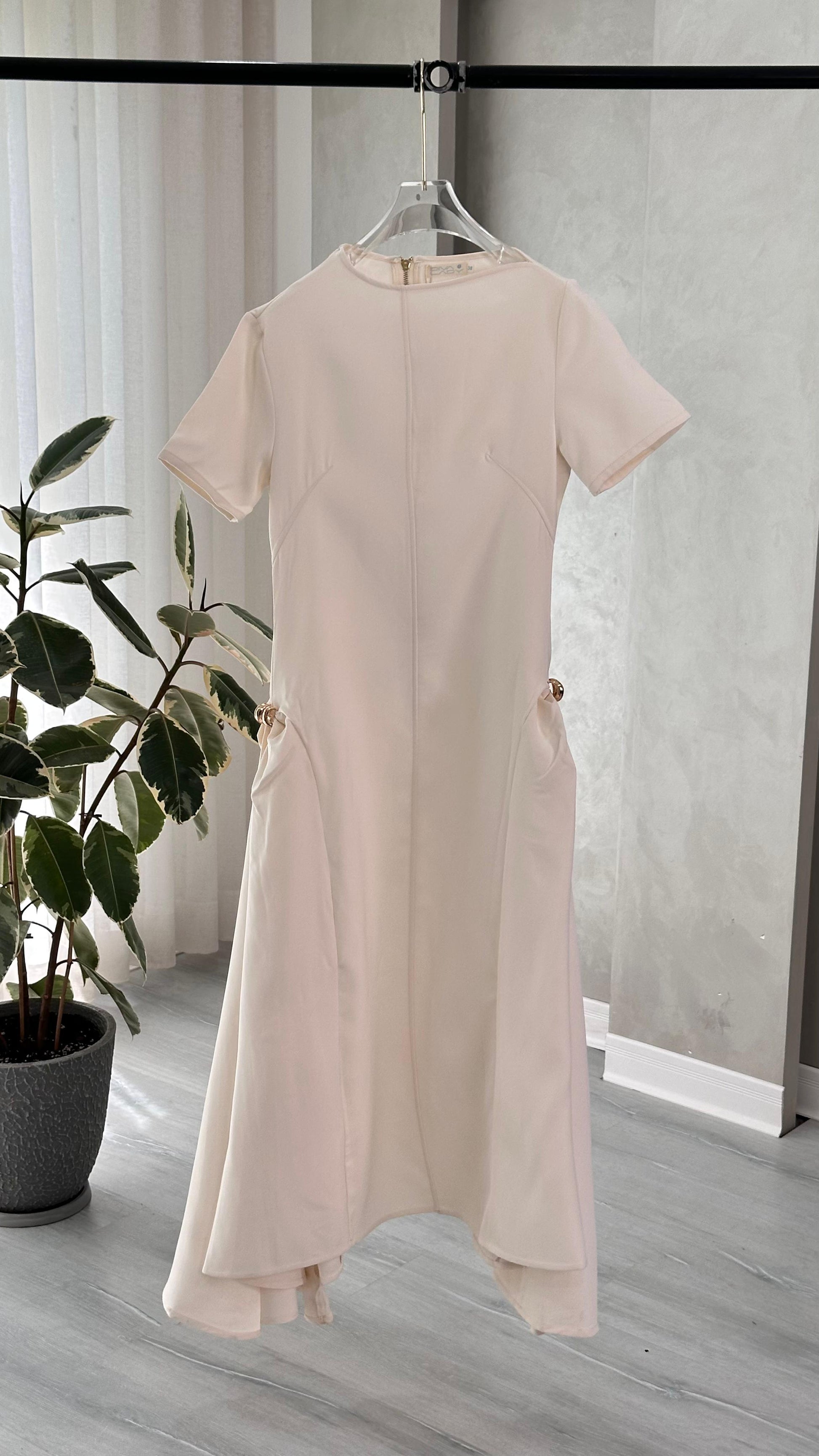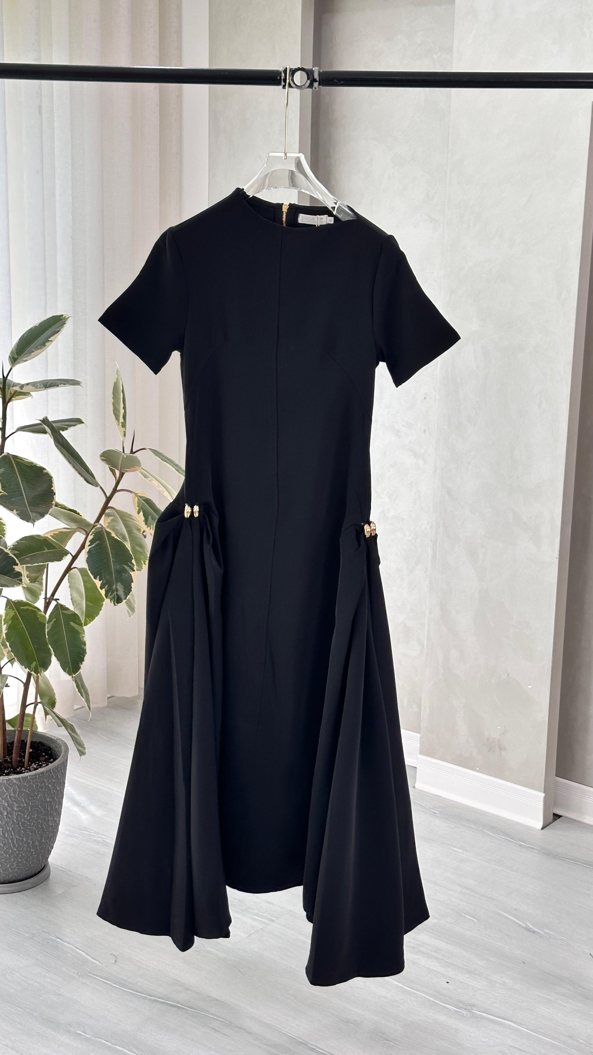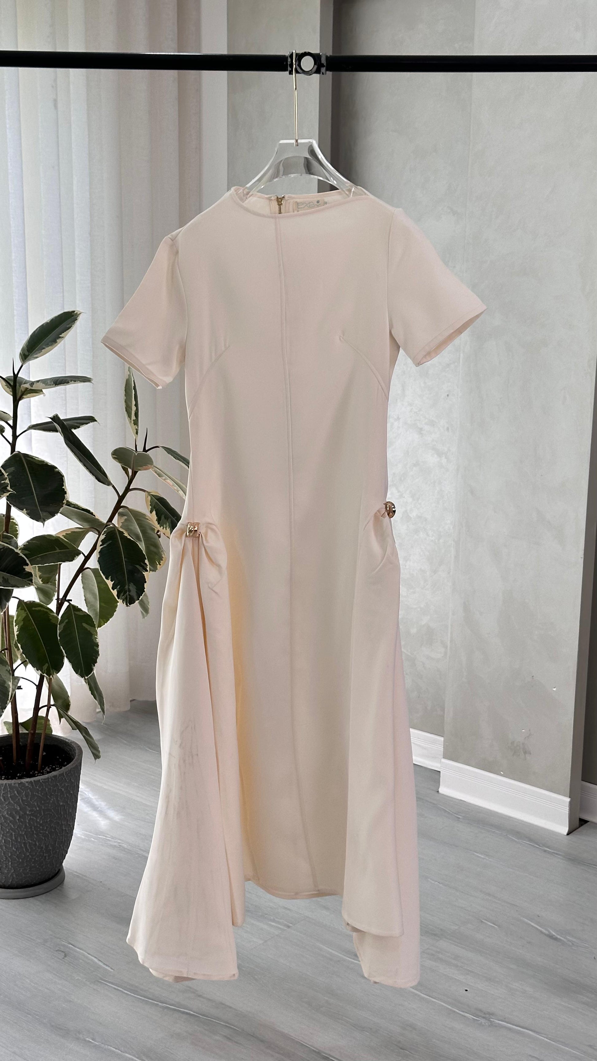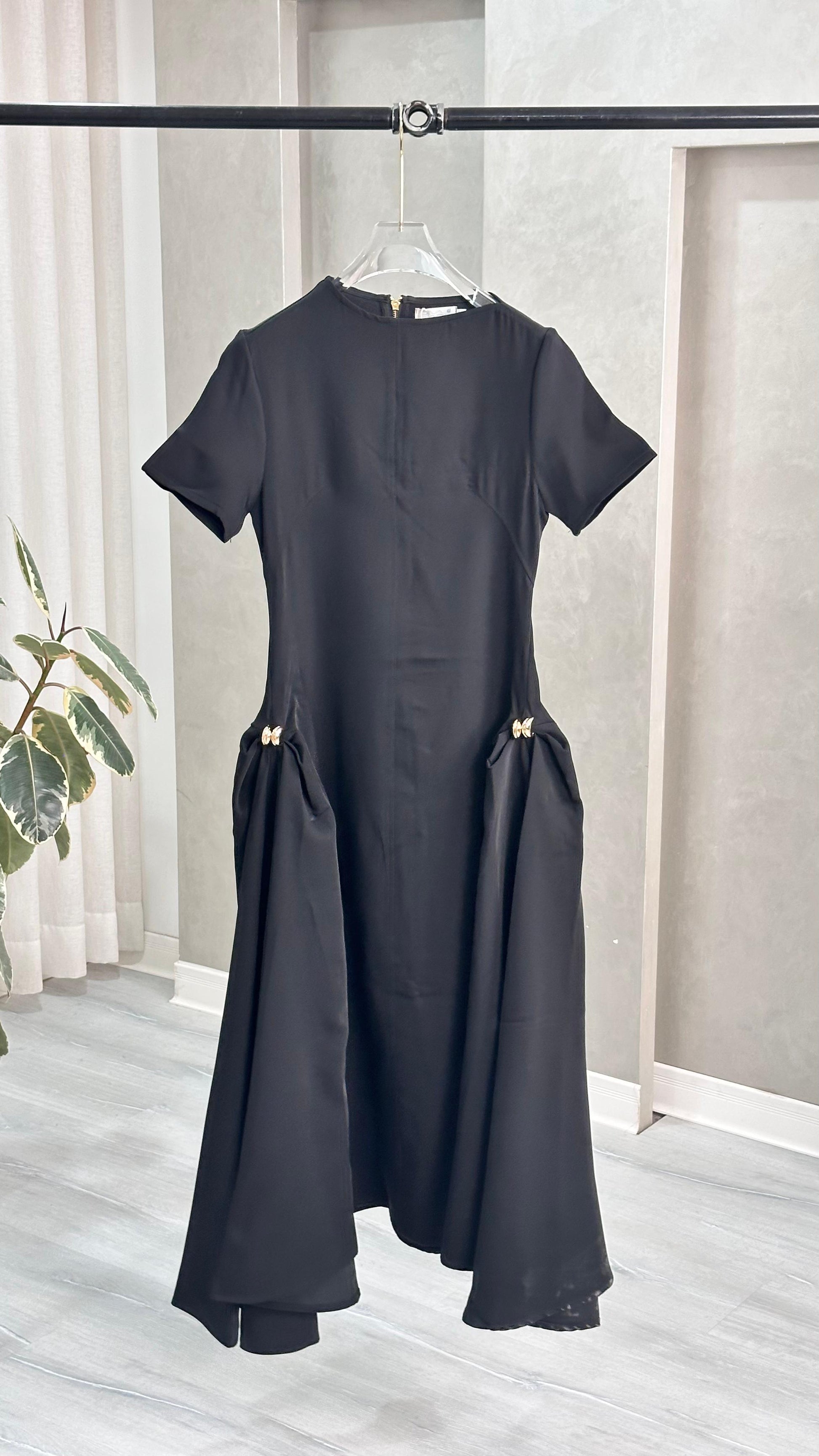 فستان أنيق بتصميم كلاسيكي عصري، يتميز بقصة واسعة وانسيابية تضيف لمسة من الرقي والأنوثة. مزود بأكمام قصيرة لمظهر أنثوي ناعم، مع تفاصيل طيات عمودية تمنح التصميم حركة وجاذبية. مثالي للمناسبات الخاصة والسهرات، ويجمع بين البساطة والفخامة في آن واحد.
