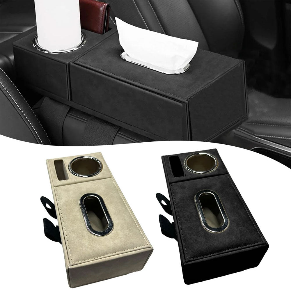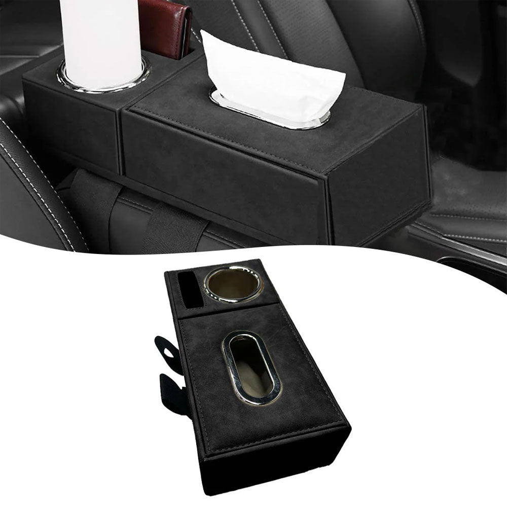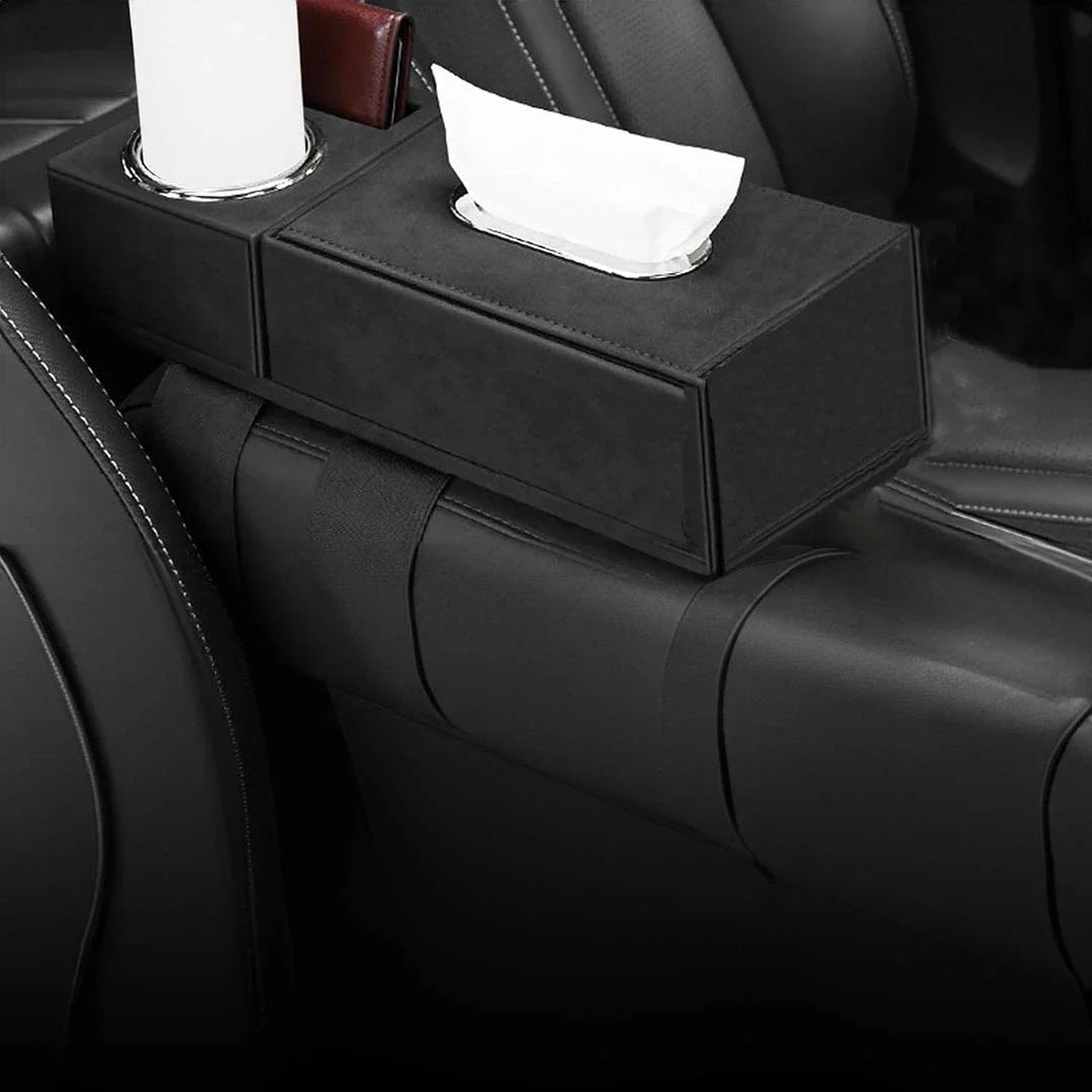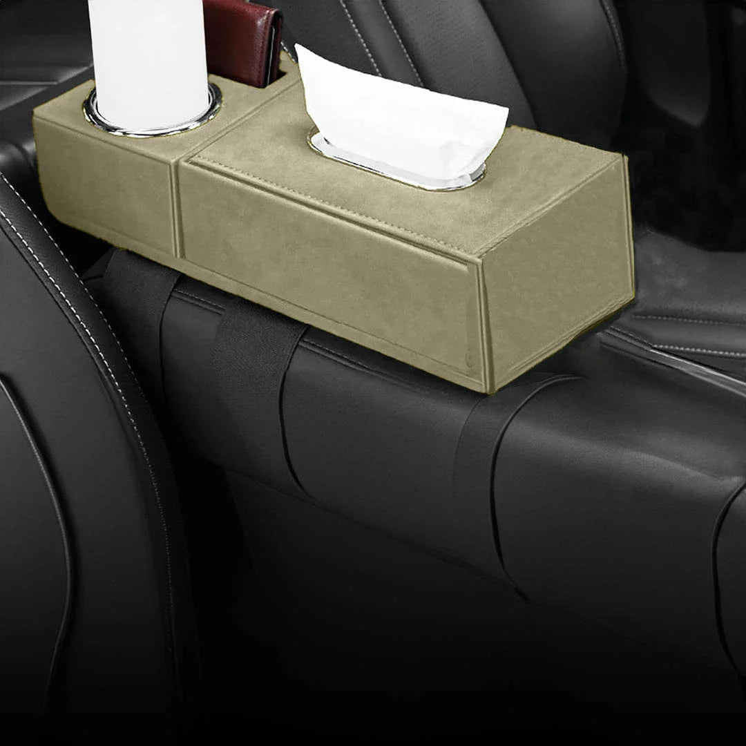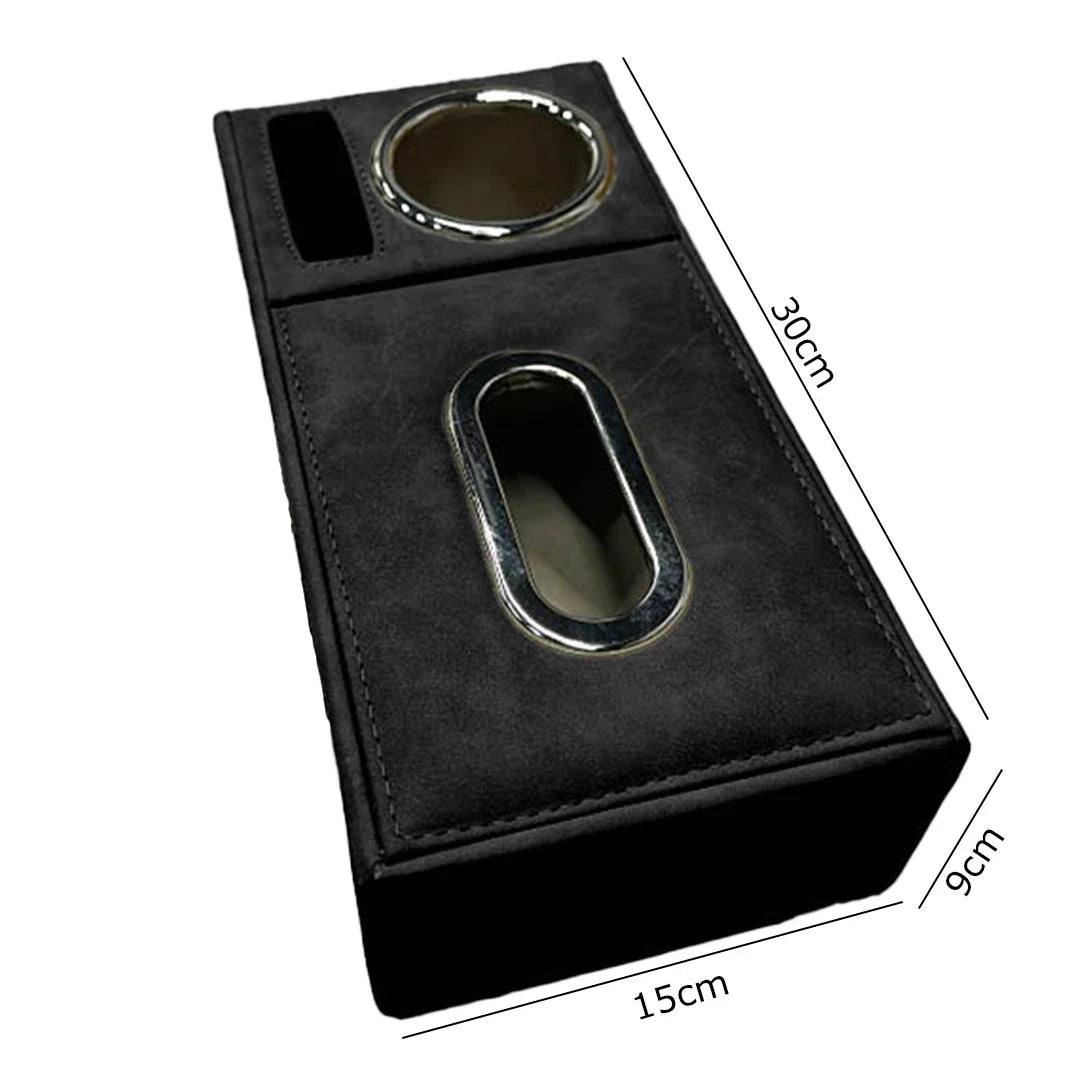 Consisting of two parts: a section for storing paper tissues and another section for holding cup of drinks and designated place for your phone or wallet.