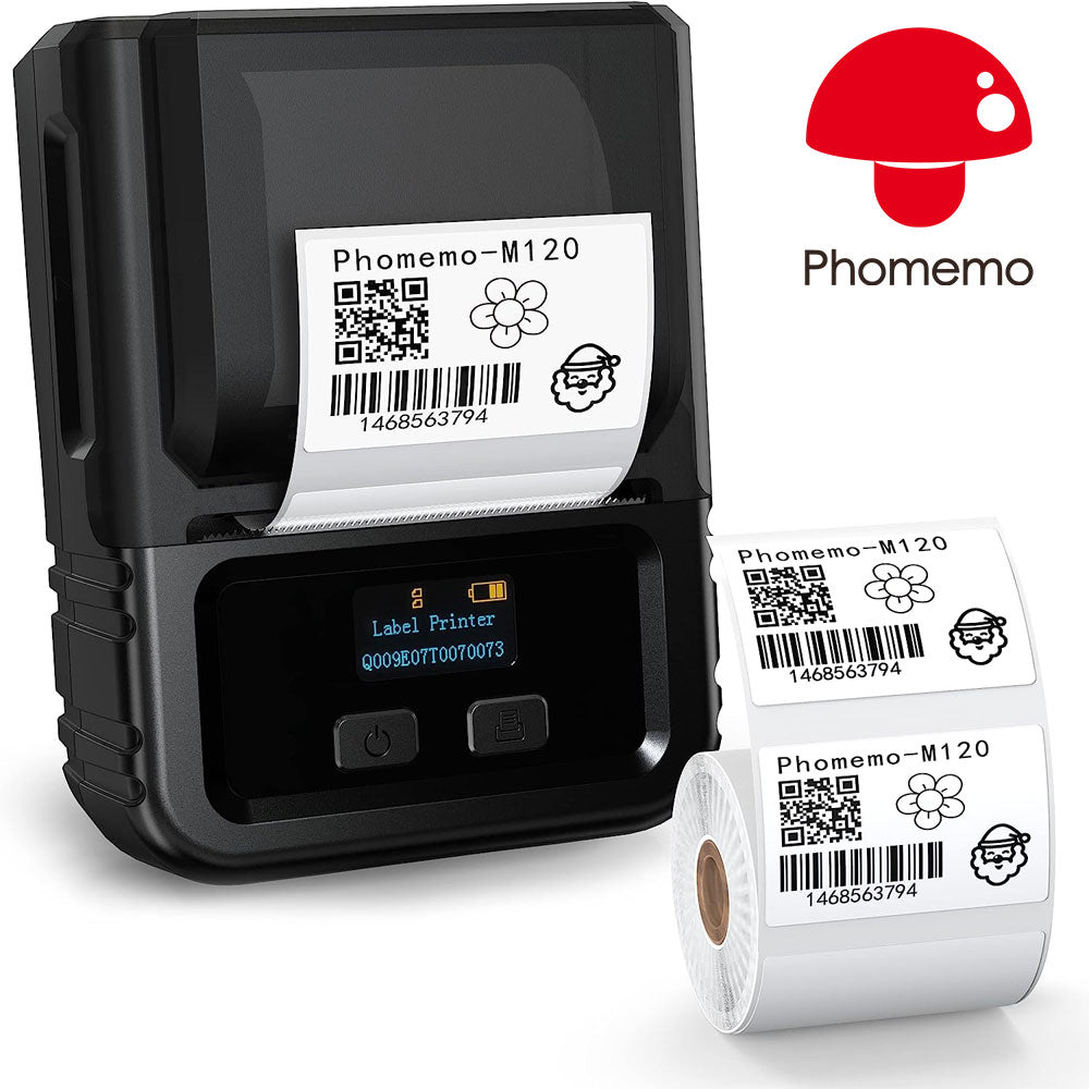 صانع ملصقات Phomemo M120، طابعة ملصقات باركود، طابعة ملصقات حرارية صغيرة محمولة تعمل بالبلوتوث للبيع بالتجزئة، رمز QR، الصور والأعمال الصغيرة، متوافقة مع Android وiOS والكمبيوتر الشخصي، أسود