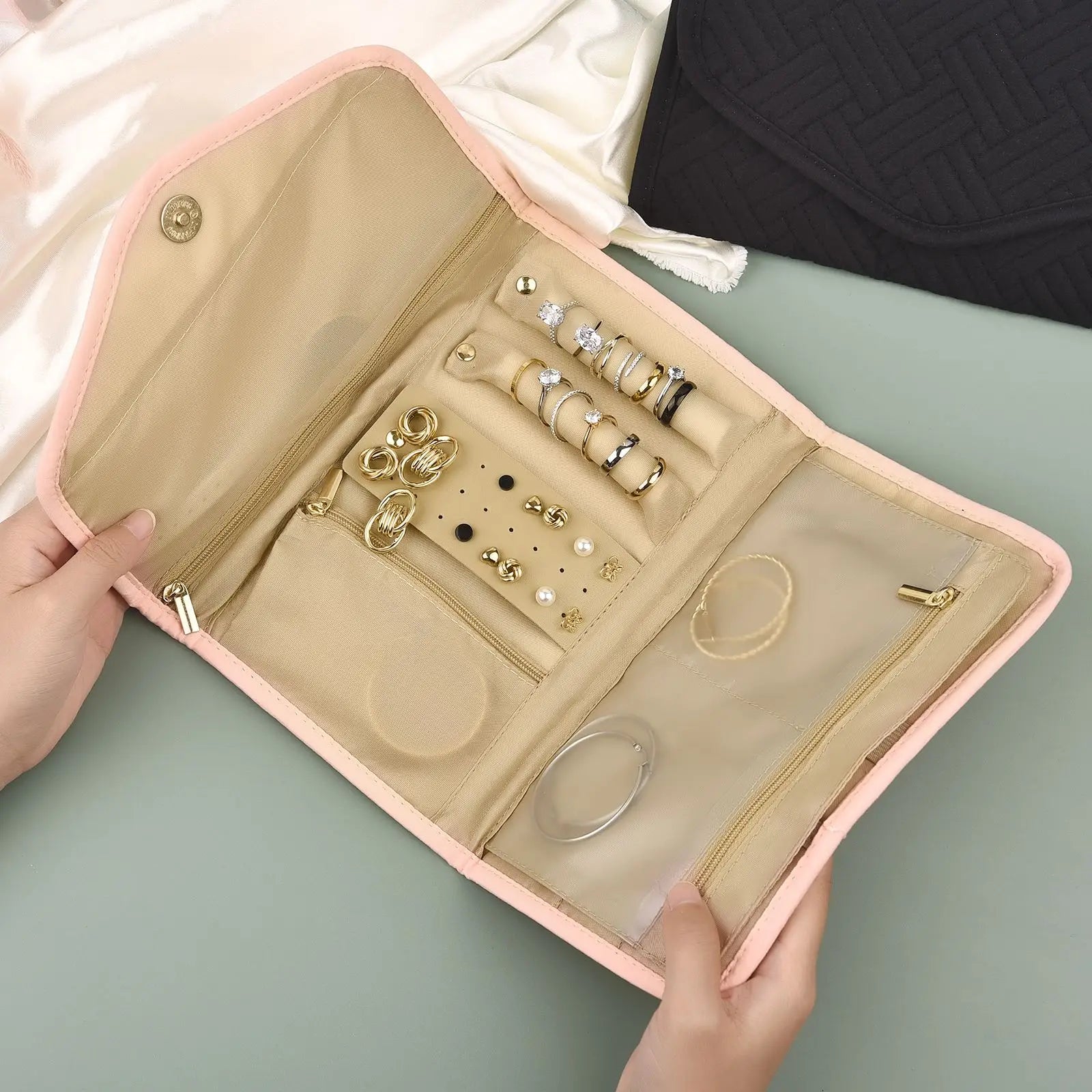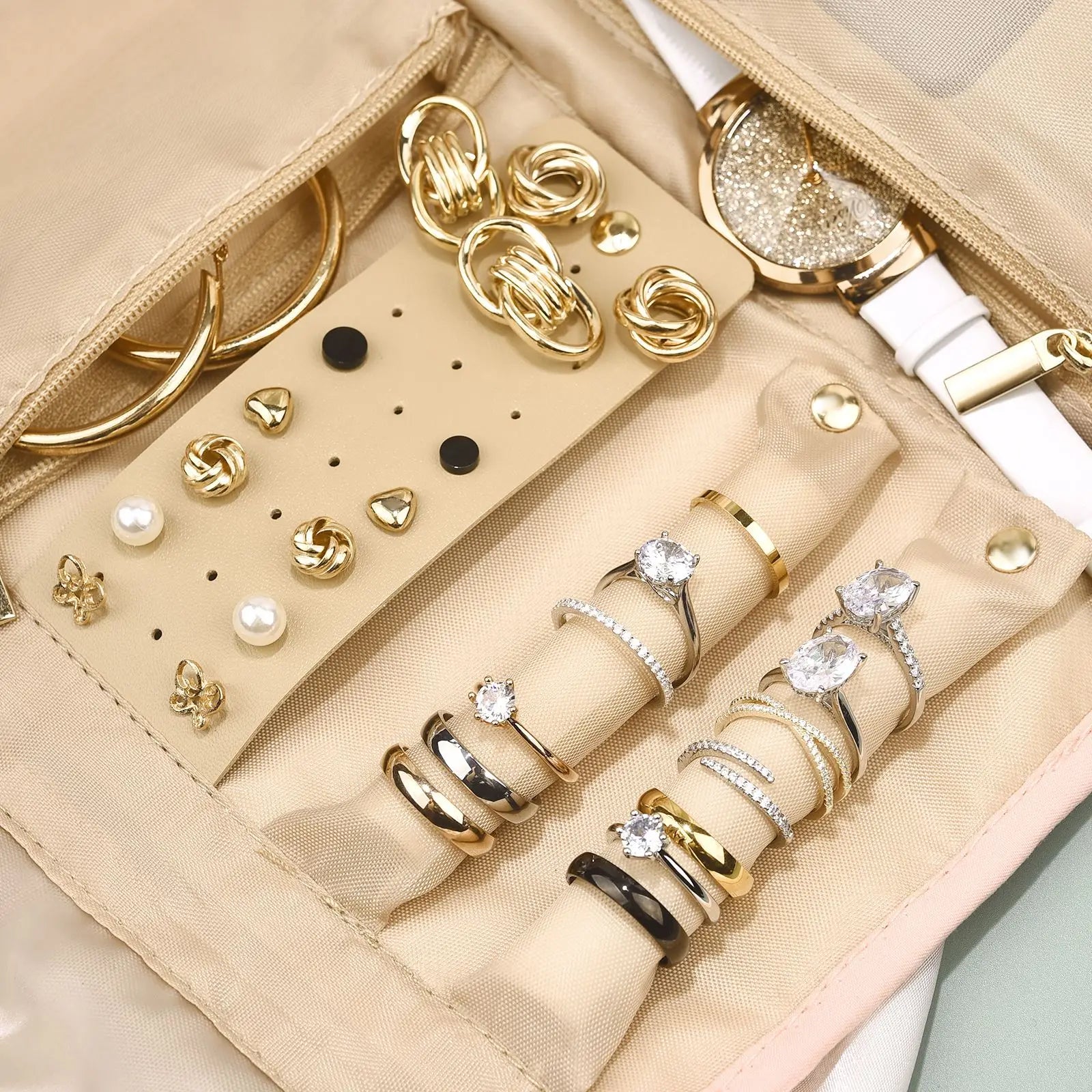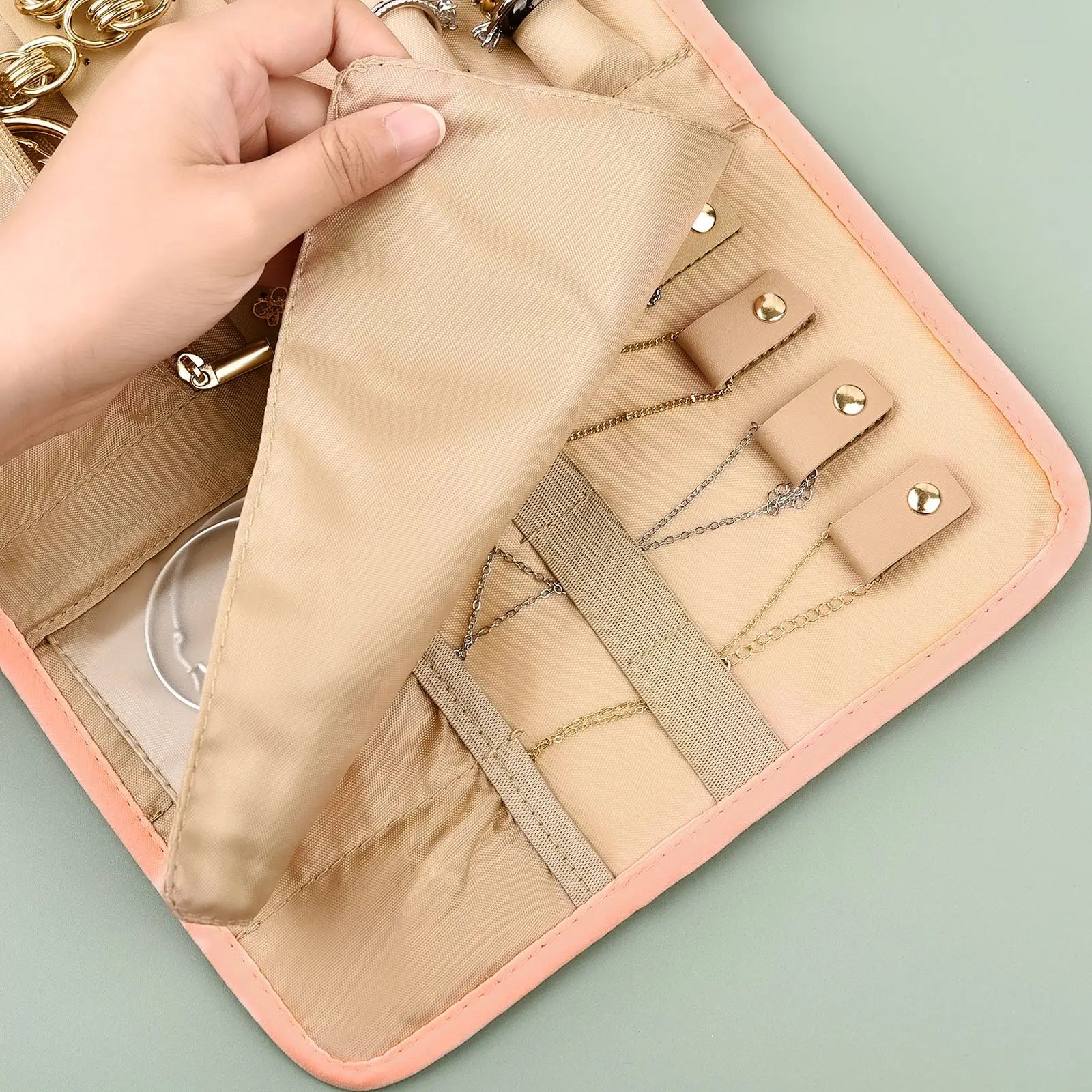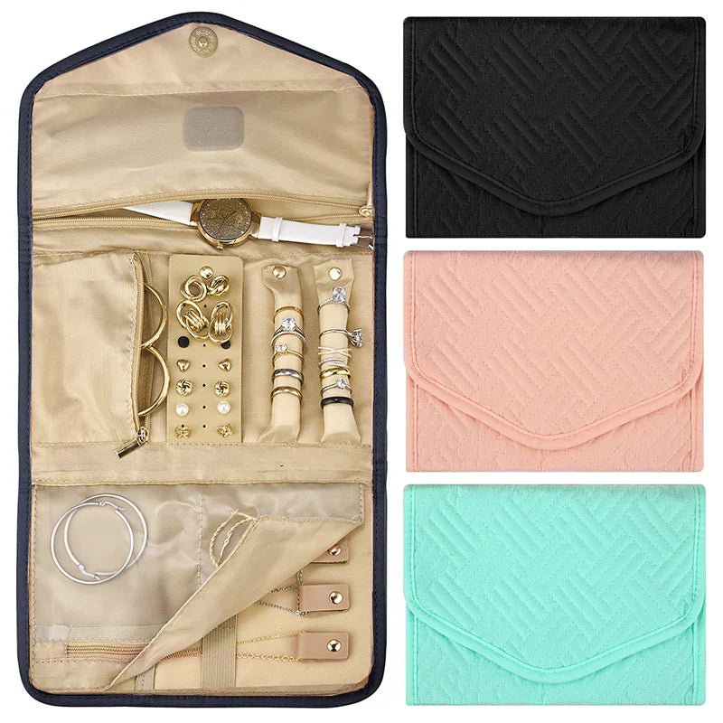 حقيبة تنظيم مجوهرات السفر قابلة للطي لتعبئة المجوهرات والقلائد والأساور والأقراط وحقيبة تخزين منظم لحزام الساعة