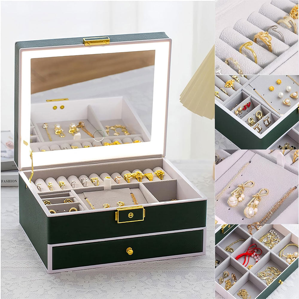 صندوق مجوهرات نسائي منظم مجوهرات بطبقتين، منظم حديث مع مرآة و3 مصابيح LED ملونة، مناسب للخواتم والأقراط والقلائد والأساور