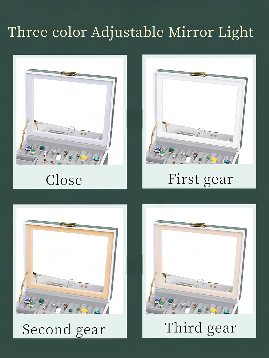 - مرآة ذكية ومصابيح LED: تضمن المرآة المدمجة، المزودة بإضاءة ملء، سهولة الوصول إلى مجوهراتك وتعزز الرؤية، مما يلغي الحاجة إلى مرآة إضافية. تضيف مصابيح LED ذات 3 ألوان لمسة من الأناقة والقليل من المرح لتخزين مجوهراتك.