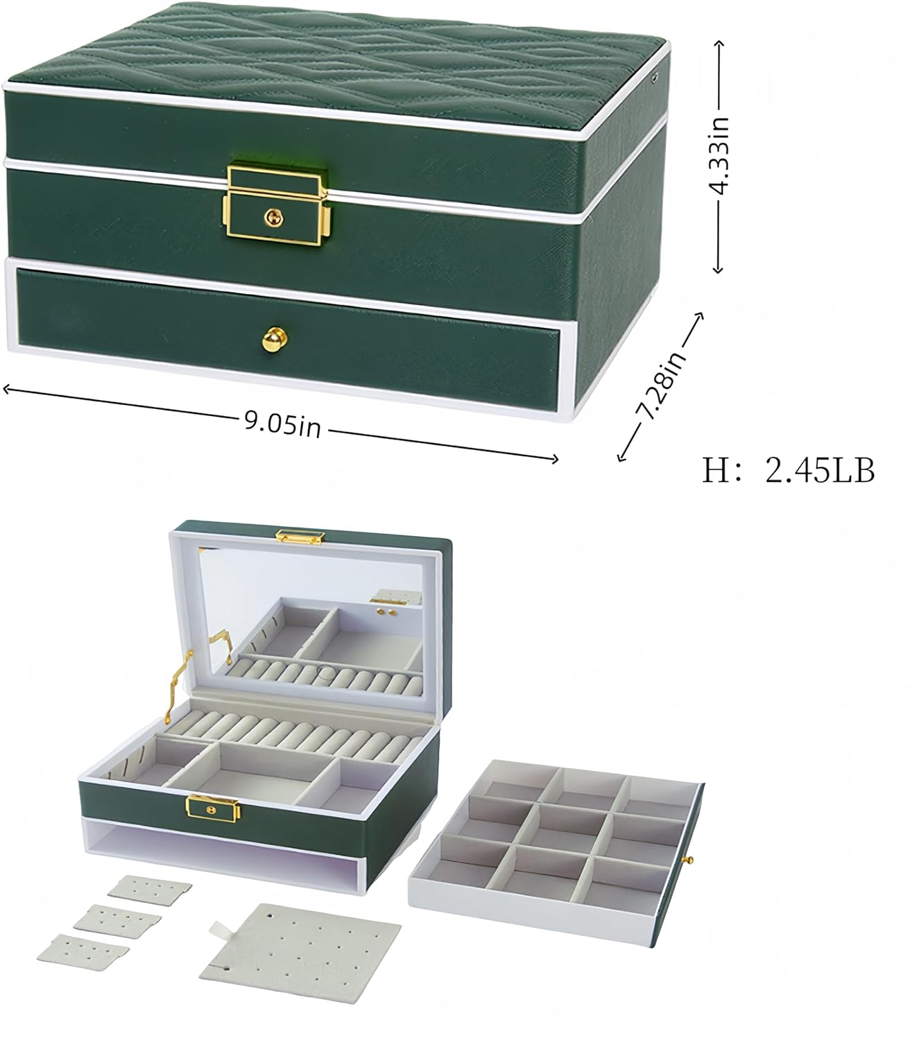 - حجم صغير: بحجم 9.05 × 7.28 × 4.33 بوصة فقط، يعد صندوق المجوهرات النسائي هذا مثاليًا لتنظيم جميع أغراضك الثمينة الصغيرة. صغير الحجم ولكنه واسع، ويناسب تمامًا خزانة ملابسك أو طاولة الزينة أو سطح الحمام دون أن يشغل مساحة كبيرة.